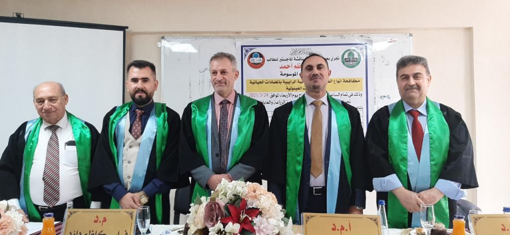 بحضور السيد عميد الكلية الدكتور محمد يونس العلاف نوقشت في قسم وقاية النبات صباح اليوم الثلاثاء رسالة ماجستير تقدم بها الطالب حذيفة ناظم احمد والموسومة (مكافحة انواع الفايروسات النباتية الرايبية بالمضادات الحياتية والمركبات الفينولية)