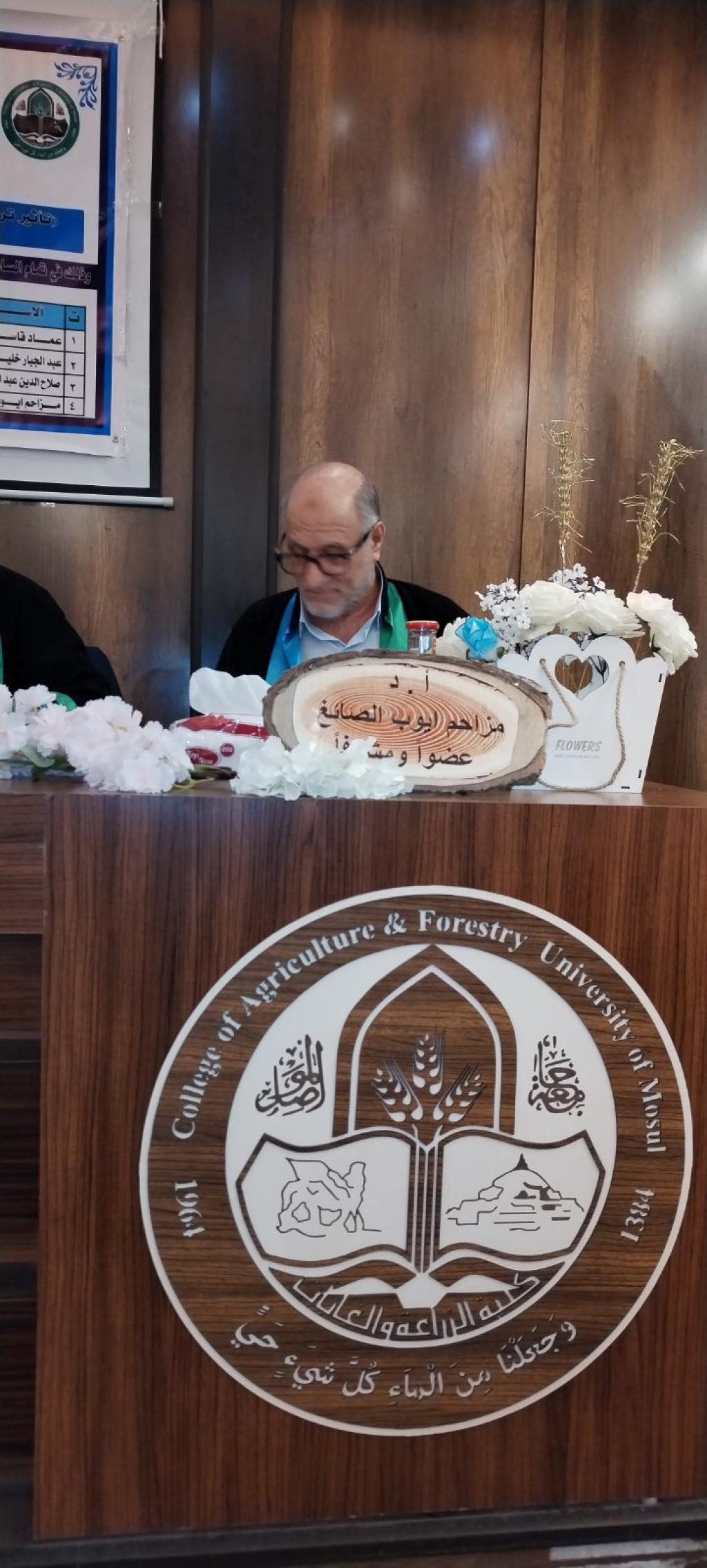 بحضور الأستاذ الدكتور محمد يونس العلاف عميد الكلية نوقشت صباح اليوم وعلى قاعة عمادة الكلية رسالة الماجستير في قسم وقاية النبات والتي تقدمت بها الطالبة دعاء عبد المناف احمد والموسومة (تأثير تراكيز مختلطة من حامض الاوكزاليك كمعاملة خريفية ضد حلمة الفاروا على طوائف النحل) وترأس لجنة المناقشة الاستاذ الدكتور عماد قاسم محمد وعضوية الدكتور عبد الجبار خليل ابراهيم والدكتور صلاح الدين عبد القادر صالح وبإشراف الاستاذ الدكتور مزاحم ايوب الصائغ.