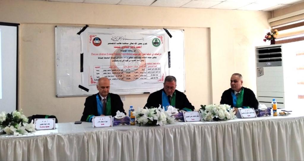بحضور السيد عميد الكلية الاستاذ الدكتور محمد يونس العلاف نوقشت في قسم وقاية النبات رسالة الماجستير للطالب احمد ثامر حمادي والموسومه ( دراسات في ذبابة ثمار القرعيات Dacus ciliatus Loew family :Tephritidae