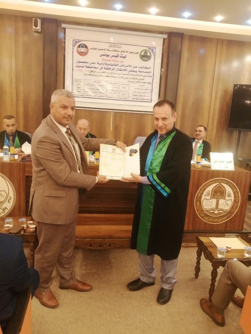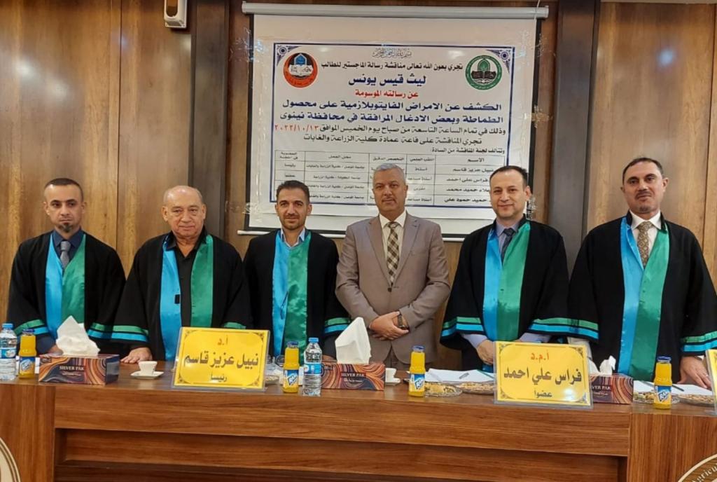 نوقشت اليوم وعلى قاعة عمادة كليتنا رسالة الماجستير في قسم وقاية النبات تقدم بها الطالب ليث قيس يونس والموسومة (الكشف عن الامراض الفايتوبلازمية على محصول الطماطه وبعض الادغال المرافقة في محافظة نينوى) حضر جانب منها السيد عميد الكلية الاستاذ الدكتور محمد يونس العلاف ومعاونيه للشؤون العلمية والإدارية.