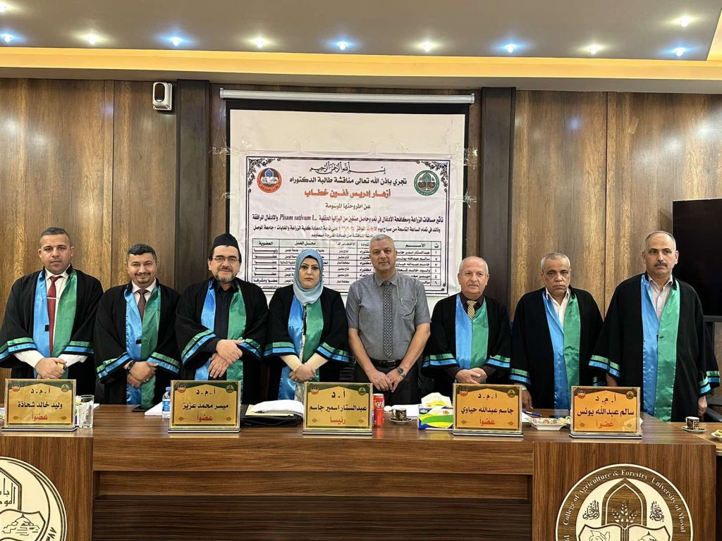 ناقش قسم وقاية النبات في كلية الزراعة والغابات بجامعة الموصل رسالة ماجستير عـن ( دراسات بيئية وحياتية الدودة الجياشة الخريفية Spodoptera frugipeerda على محصول الذرة الصفراء في ناحية النمرود مع الإشارة إلى مكافحتها كيميائيا )