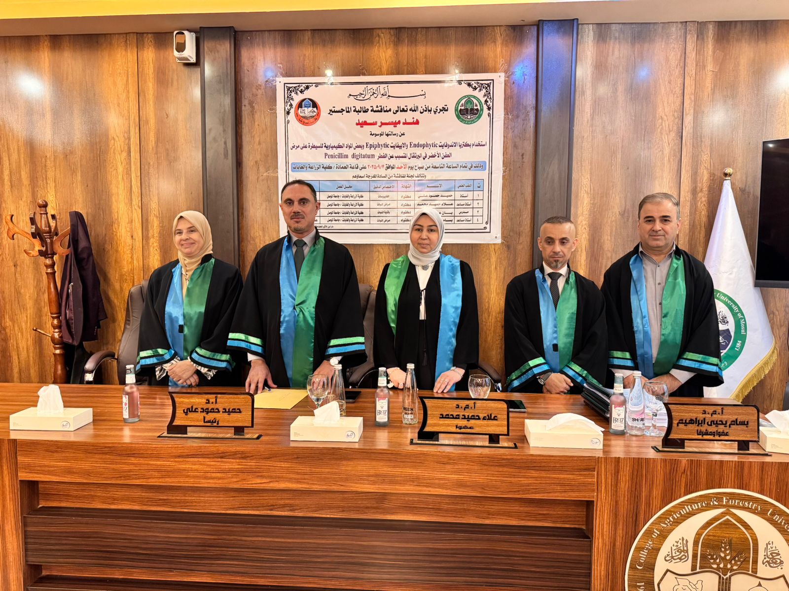 وقد ترأس لجنة المناقشة الاستاذ الدكتور حميد حمود علي وعضوية كلٌّ من الدكتور علاء حميد محمد والدكتورة بان علي احمد وبإشراف الدكتور بسام يحيى ابراهيم.