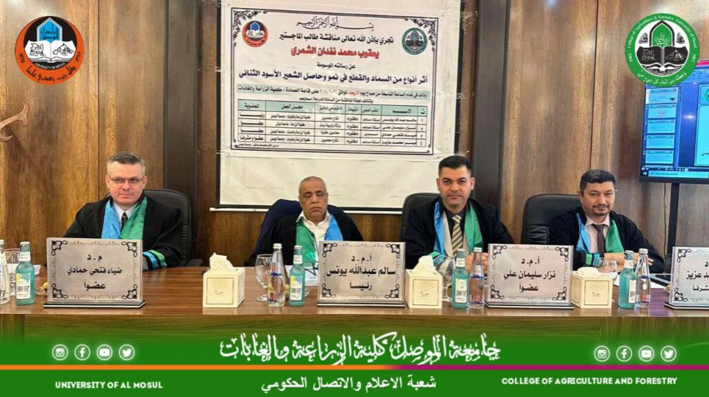 حظيت مناقشة رسالة ماجستير في قسم المحاصيل الحقلية في كلية الزراعة والغابات بجامعة الموصل بحضور السيد رئيس جامعة الموصل الاستاذ الدكتور قصي كمال الدين الاحمدي والموسومة