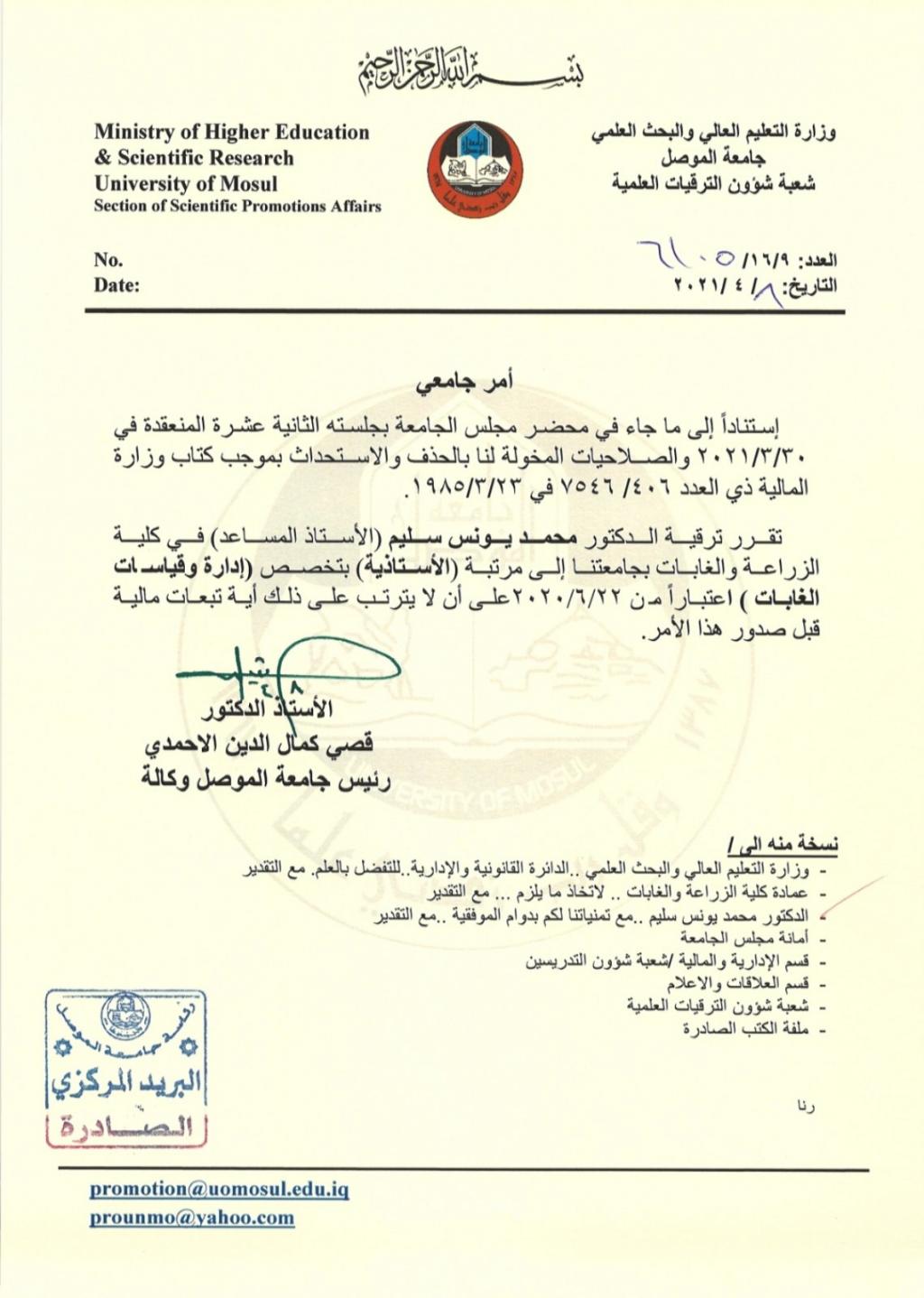تتقدم الأسرة التعليمية في كلية الزراعة والغابات وجميع منتسبيها من الموظفين بأحر التهاني وأجمل التبريكات للسيد عميد الكلية الدكتور محمد يونس العلاف لحصوله على لقب الأستاذية متمنين له دوام النجاح والتوفيق في مسيرته العلمية خدمة لعراقنا الحبيب وجامعتنا العزيزة.شعبة الاعلام والعلاقات العامة