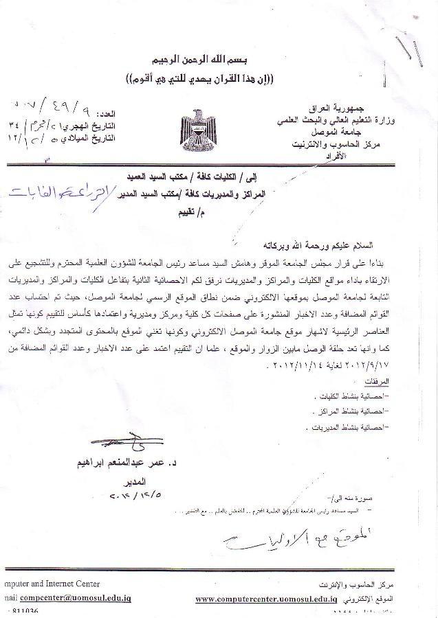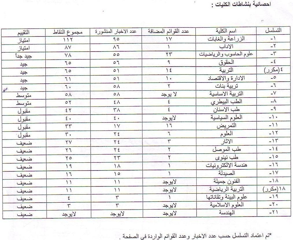 موقع كلية الزراعة والغابات الالكتروني يحصل على المرتبة الأولى ضمن تقييم المواقع الالكترونية لكليات ومراكز جامعة الموصل