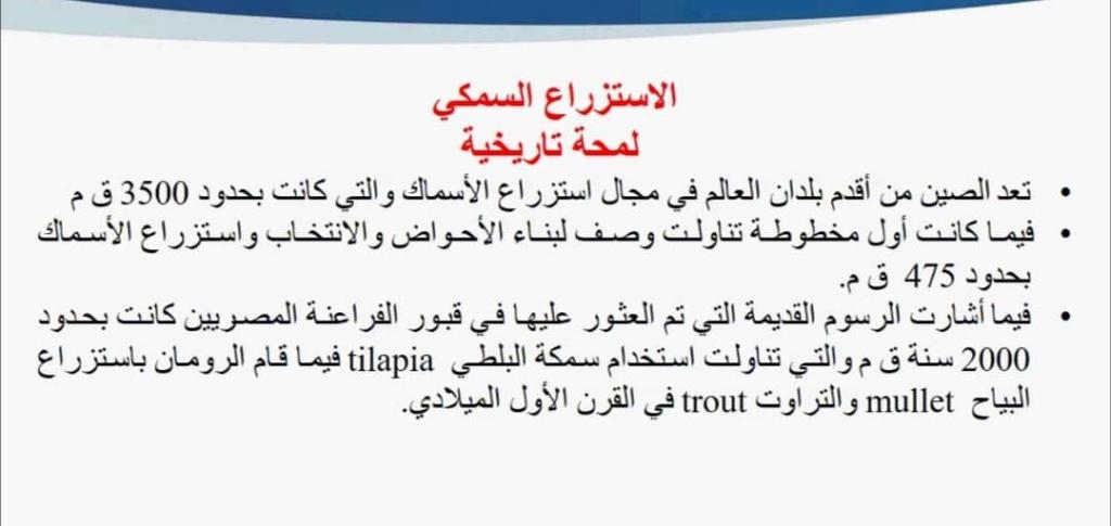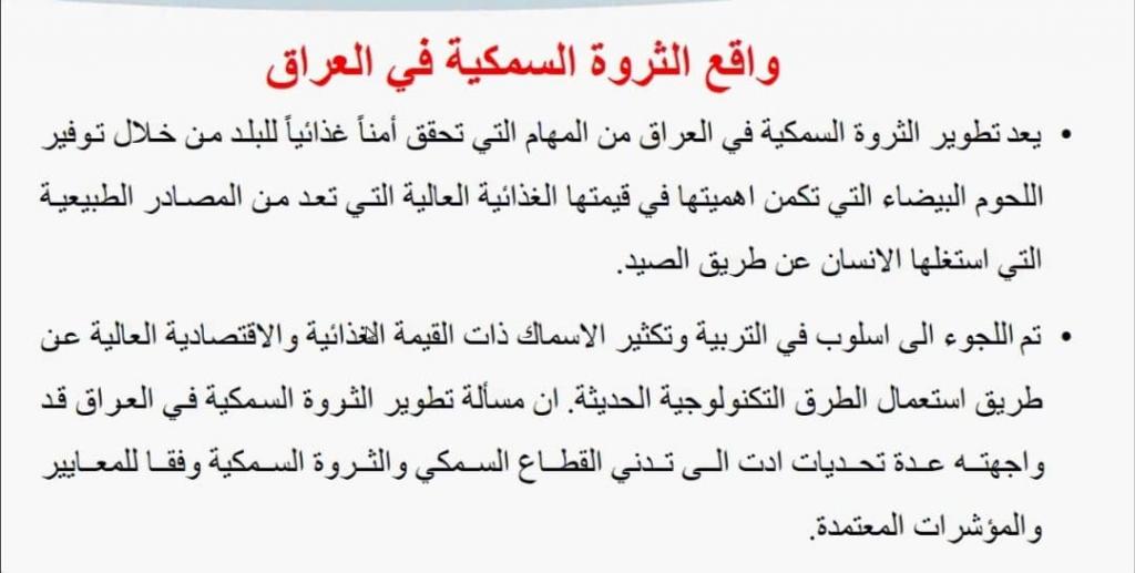 وتم التطرق في المحاضرة الى ان هناك طرق عديدة لتربية الاسماك من اهمها (التربية في الأقفاص والتربية في الأحواض الترابية والتربية في الأحواض الصناعية )