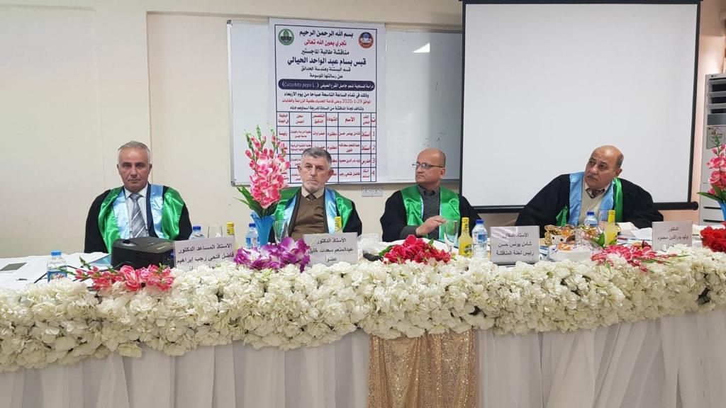 بحضور السيد عميد الكلية الدكتور محمد يونس العلاف والسادة معاونيه للشؤون الادارية والعلمية نوقشت في قسم البستنة وهندسة الحدائق رسالة الماجستير للطالبة قبس بسام عبد الواحد في رسالتها الموسومة دراسة فسلجية لنمو حاصل القرع الصيفي وتألفت لجنة مناقشة الطالبة من