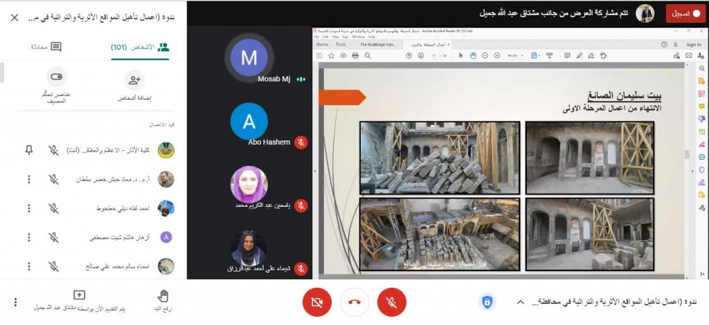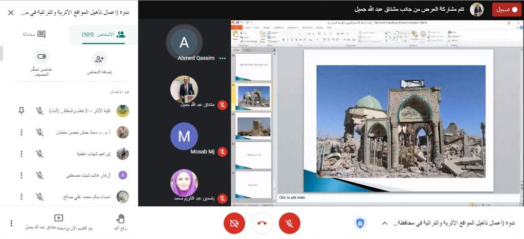 اقام قسم الآثار ندوته العلمية الالكترونية الموسومة (أعمال تأهيل المواقع الأثرية والتراثية في محافظة نينوى)يوم الخميس الموافق 2021/2/25 الساعة الثامنة مساءً و عبر الفضاء الالكتروني وعلى منصة Google Meet،بينت الندوة اهم اعمال تأهيل المواقع الثرية والتراثية في محافظة نينوى وسبل اعادة اعمارها ،قسمت الندوة الى محاضرتين الأولى القى فيه أ.د. أحمد قاسم الجمعةاهم العوامل وسبل اعادة تأهيل جامع النوري الكبير ومنارة الحدباء والمحاضرة الثانية القاها السيد مصعب محمد جاسم وبين فيها اهم المشاريع الأثرية والتراثية التي تعمل عليها مفتشية آثار وتراث نينوى .