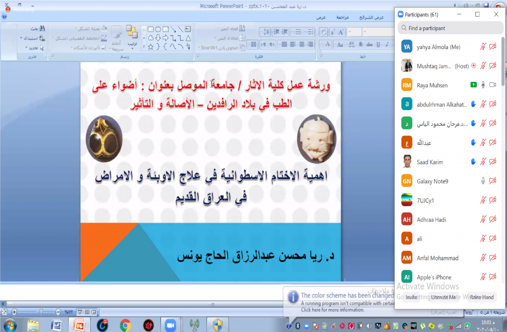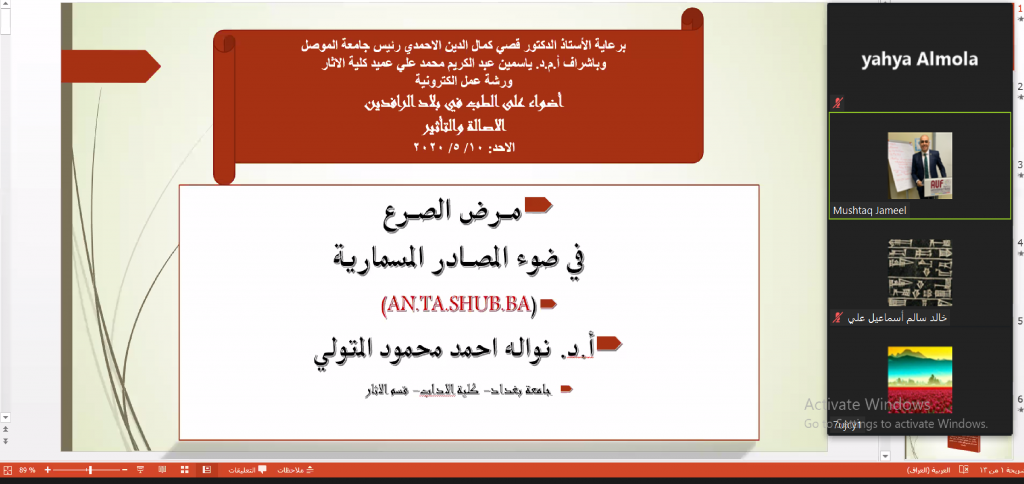 برعاية الاستاذ الدكتور قصي كمال الدين الاحمدي المحترم رئيس جامعة الموصلوباشراف السيدة عميد كلية الاثار أ.م.د. ياسمين عبد الكريم المحترمةاقامت كلية الاثار بجامعة الموصل الورشة العلمية الموسومة(اضواء على الطب في بلاد الرافدين الاصالة والتاثير)يوم الاحد الموافق 10/5/2020 في تمام الساعة التاسعة مساءًوقام بالقاء الورشة كل من(أ.د. نوالة احمد محمود محاضرة بعنوان (مرض الصرع في ضوء المصادر المسمارية في بلاد الرافدين(د. ريا محسن عبد الرزاق محاضرة بعنوان (اهمية الاختام الاسطوانية في علاج الاوبئة والامراض في العراق القديم