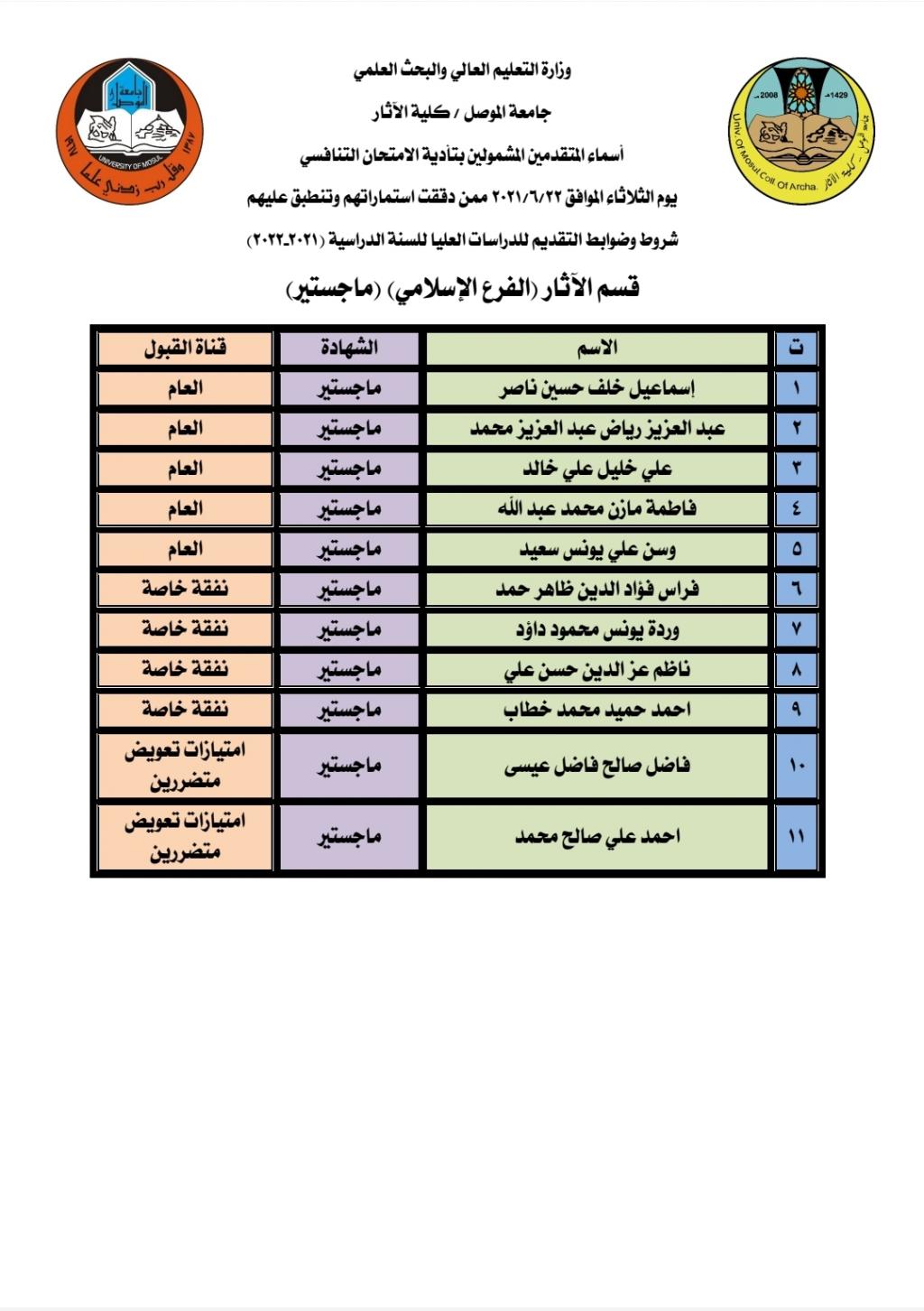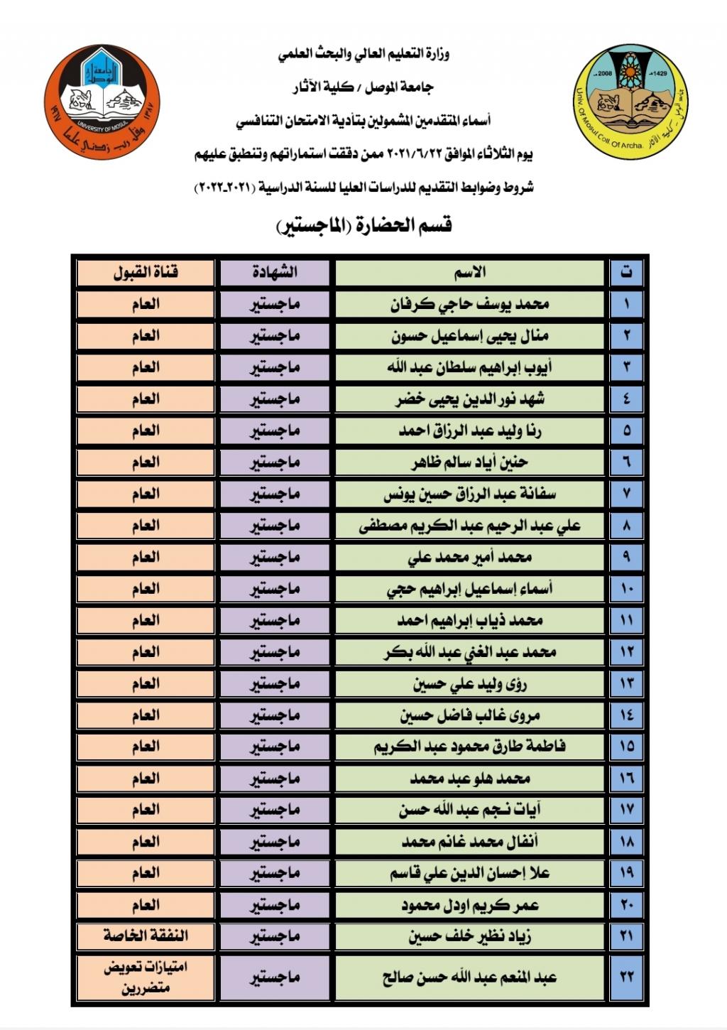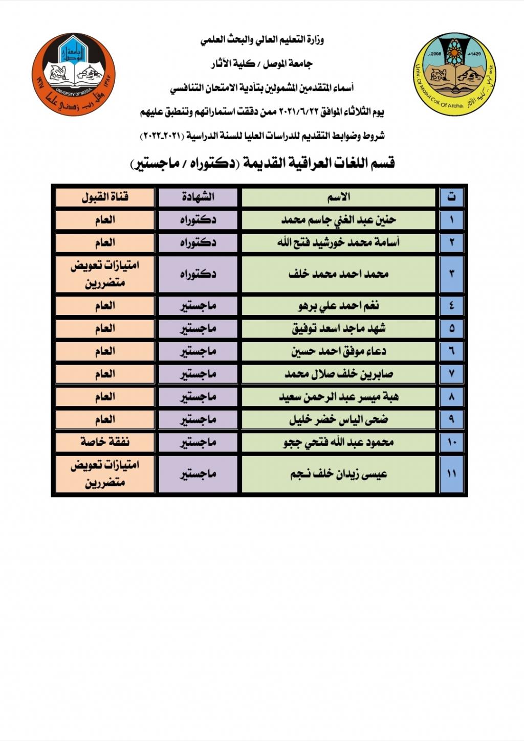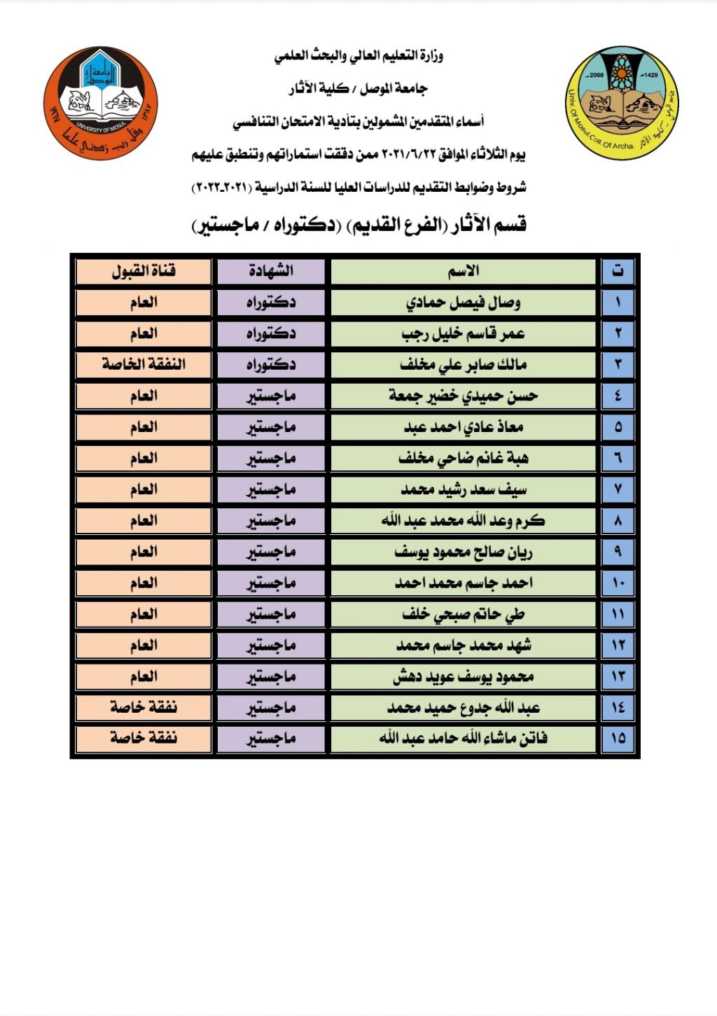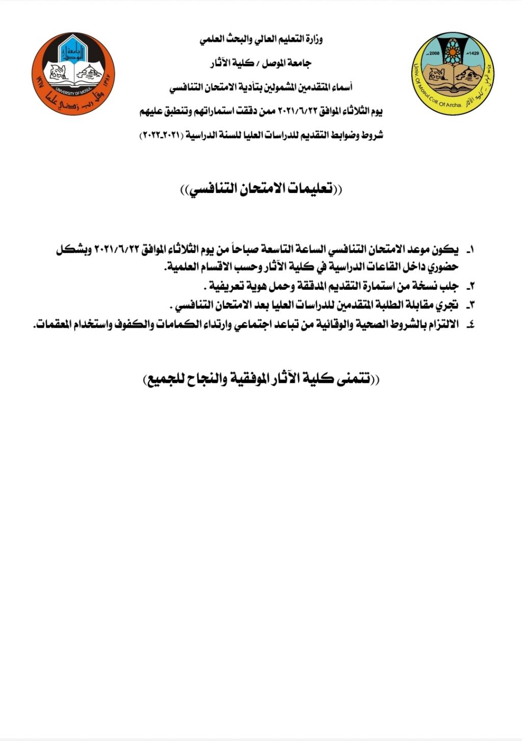 تعلن كلية الآثار عن أسماء الطلبة المتقدمين للدراسات العليا (دكتوراه – ماجستير)المدققة استماراتهم وتنطبق عليهم شروط وضوابط الدراسات العليا للسنة الدراسية (2021-2022)والذين يستطيعون تأدية الامتحان التنافسي يوم الثلاثاء الموافق 2021/6/22 الساعة التاسعة صباحاً