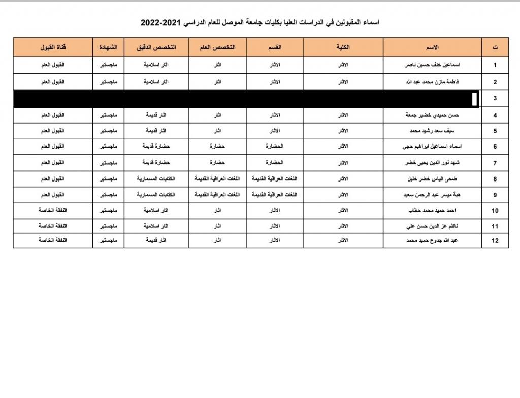 تعلن كلية الآثار عن أسماء طلبة الدراسات العليا المشمولين في قبول التوسعة الأخيرة للسنة الدراسية (2021-2022)ملاحظة : على الطلبة الراغبين في التدوير من القناة العامة الى قناة النفقة الخاصة مراجعة الكلية .