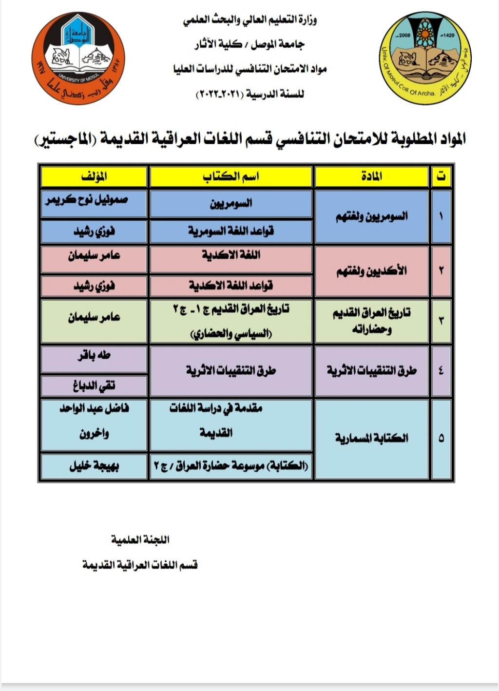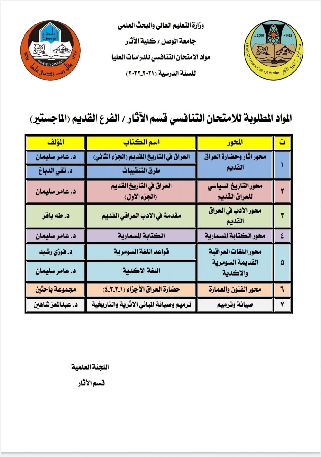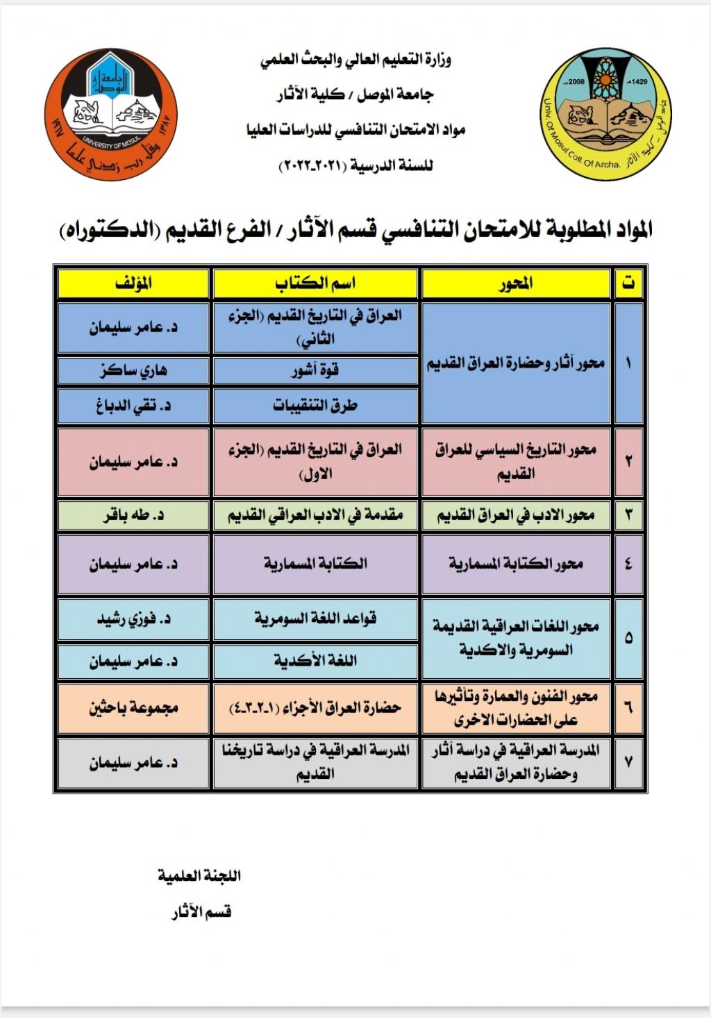 ((اعلان)تعلن كلية الآثار عن مفردات الأمتحان التنافسي للدراسات العليا للسنة الدراسي (2021-2022)1- قسم الآثار / الفرع القديم (دكتوراه)2- قسم الآثار / الفرع القديم (ماجستير)3- قسم الآثار / الفرع الإسلامي (ماجستير)4- قسم الحضارة (ماجستير)5- قسم اللغات العراقية القديمة (دكتوراه)6- قسم اللغات العراقية القديمة (ماجستير)