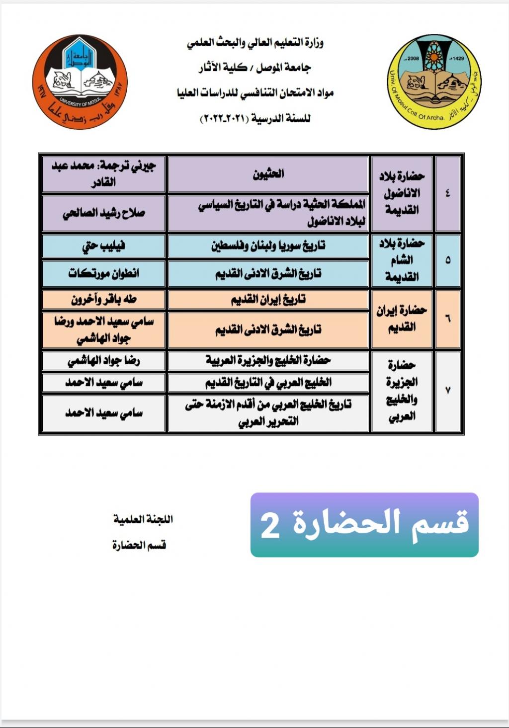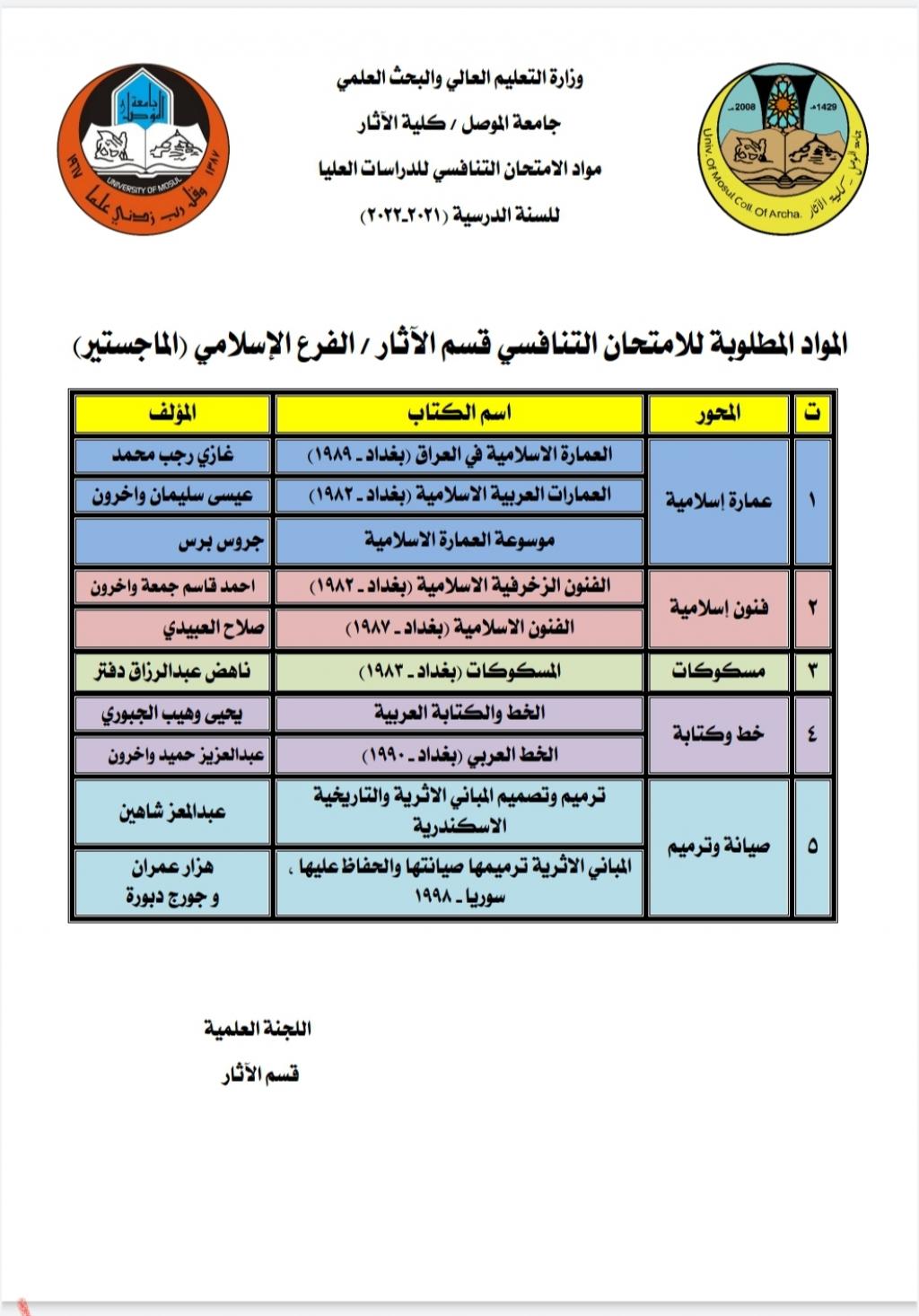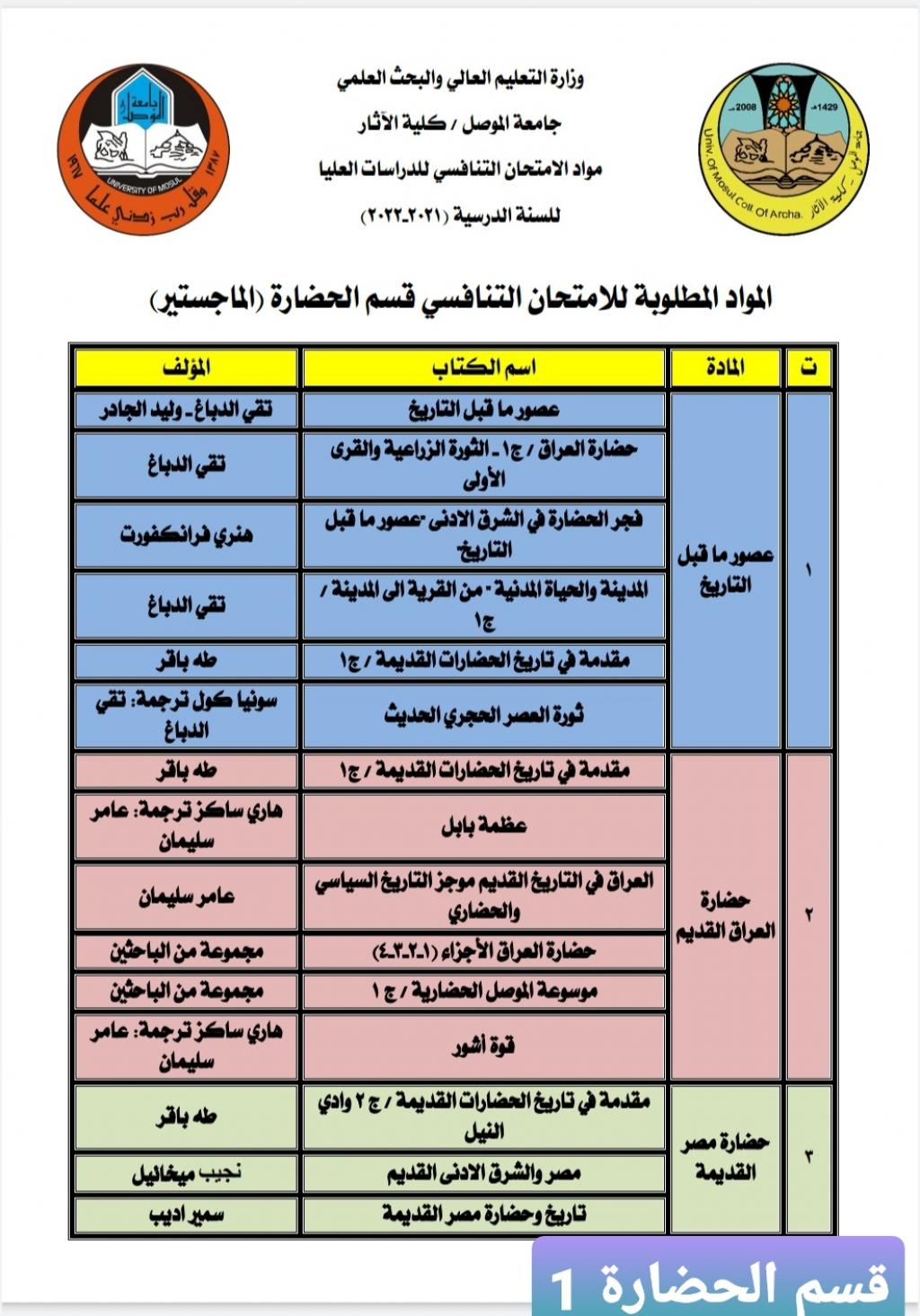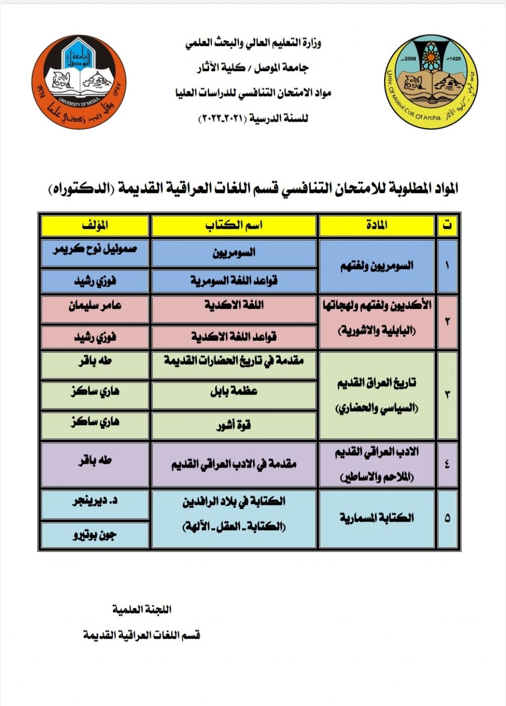 ((اعلان)تعلن كلية الآثار عن مفردات الأمتحان التنافسي للدراسات العليا للسنة الدراسي (2021-2022)1- قسم الآثار / الفرع القديم (دكتوراه)2- قسم الآثار / الفرع القديم (ماجستير)3- قسم الآثار / الفرع الإسلامي (ماجستير)4- قسم الحضارة (ماجستير)5- قسم اللغات العراقية القديمة (دكتوراه)6- قسم اللغات العراقية القديمة (ماجستير)