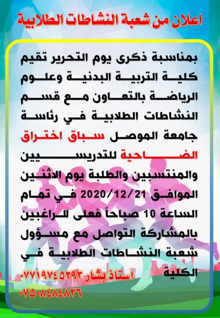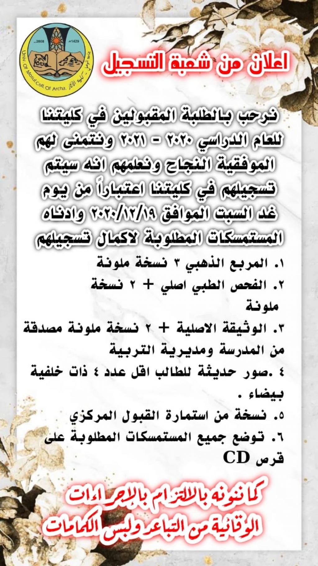 اعلان من شعبة شؤون الطلبة والتسجيلنرحب بالطلبة المقبولين في كليتنا للعام الدراسي (2020-2021) ونتمنى لهم الموفقية والنجاح ونعلمهم أنه سيتم تسجيلهم في كليتنا اعتباراً من يوم السبت الموافق 2020/12/19 ، وادناه المستمسكات المطلوبة1- المربع الذهبي 3 نسخ ملونة .2- الفحص الطبي أصلي + 2 نسخة ملونة .3- وثيقة الدراسة الاعدادية الاصلية + 2 نسخة ملونة مصدقة من المدرسة و مديرية التربية .4- صورة حديثة للطالبة أقل عدد 4 صور ذات خلفية بيضاء .5- نسخة من استمارة القبول المركزي .6- توضع جميع المستمسكات المطلوبة اعلاه على قرص (CD) .كما ننوه بالالتزام بالاجراءات الوقائية من التباعد ولبس الكمامة .