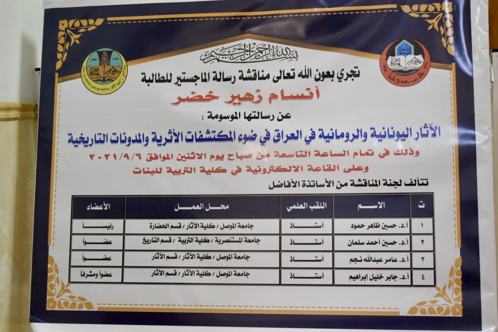 تمت صباح اليوم مناقشة رسالة الماجستير والموسومة (الاثار اليونانية والرومانية في العراق في ضوء المكتشفات الاثرية والمدونات التاريخية) للطالبة انسام زهير على القاعة الالكترونية في كلية التربية للبنات الساعة التاسعة صباحاً.