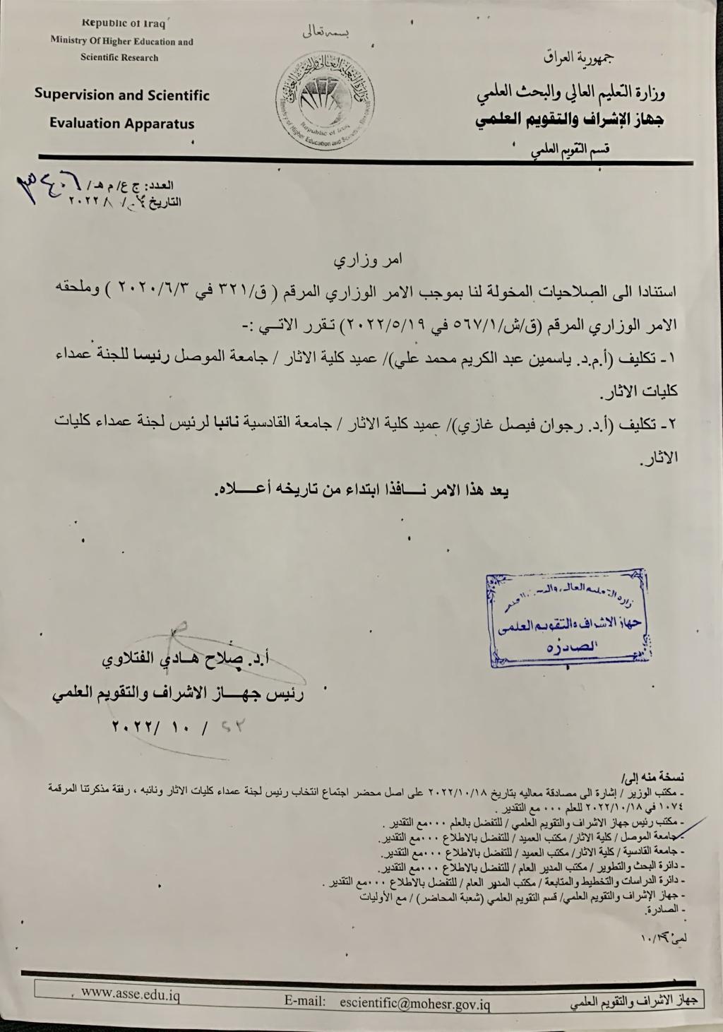 كلفت وزارة التعليم العالي والبحث العلمي الاستاذ المساعد الدكتورة ياسمين عبد الكريم عميدالكلية برئاسة لجنة عمداء كليات الاثار في العراق.وقد صدر الامر الوزاري بالتكليف المستحق الذي جاء تتويجاً لكفاءتها العلمية والادارية للارتقاءبواقع التعليم العالي في العراق بشكل عام والمستوى العلمي لكليات الاثار بشكل خاص .و من الجدير بالذكر ان لجان العمداء تأخذ على عاتقها مواكبة التطور الحاصل في العالم بحسبالتخصصات وتعمل على تحديث المناهج واقتراح استحداث الاقسام وتحدد مسارات الكلياتبالشكل الذي يتواءم مع استراتيجية وزارة التعليم العالي والبحث العلمي .