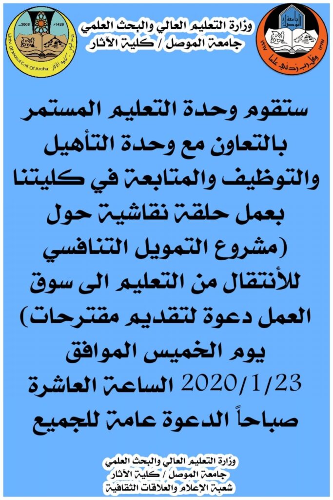 (مشروع التمويل التنافسي للانتقال من التعليم الى سوق العمل دعوة لتقديم مقترحات) حلقة نقاشية في كلية الآثار