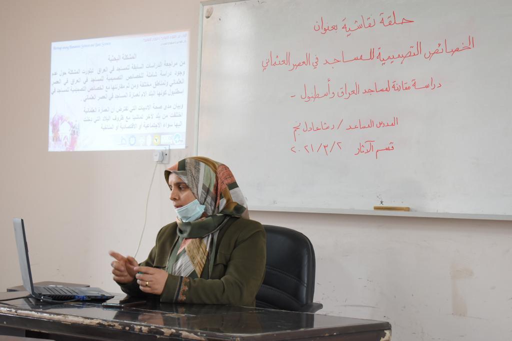 ضمن النشاطات العلمية لقسم الآثار القت م.م. رشا عادل نجم حلقة نقاشية بعنوان (الخصائص التصميمية للمساجد في العصر العثماني _دراسة مقارنة لمساجد العراق واسطنبول)الهدف من الدراسة الوصول الى اهم الخصائص التصميمية للمساجد في العراق في العصر العثماني ومقارنتها مع الخصائص التصميمية للمساجد فياسطنبول في العصر العثماني مع بيان أوجه التشابه والاختلاف بينهما ، و لتكوين قاعدة أساسية يعتمد عليها المصمم في المحافظة على الهوية المعماريةوالاستفادة منها في اعادة بناء وصيانة الابنية في المستقبل .