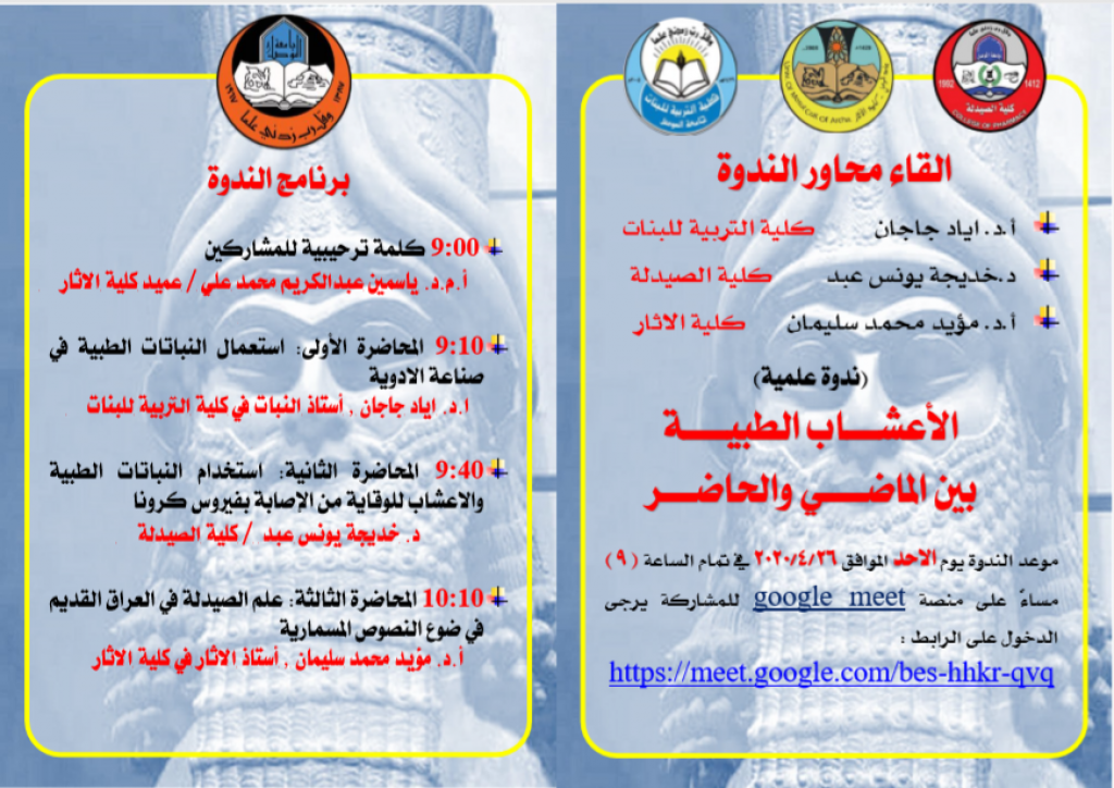 للمشاركة من قبل منتسبي جامعة الموصل يرجى الدخول بالايميل الرسمي ( الاسم@uomosul.edu.iq)رابط المشاركة بالندوةhttps://meet.google.com/bes-hhkr-qvqرابط مشاهدة البث المباشر للندوةhttps://stream.meet.google.com/stream/2ead7af2-fdb5-452a-aa6a-2c902157bfdf