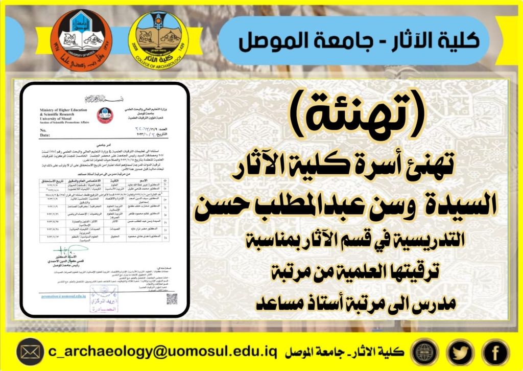 تقيم كلية الآثار جامعة الموصل مؤتمرها الدولي الرابع بعنوان ( نينوى مهد الحضارة وعطاء دائم)