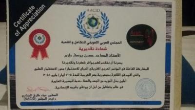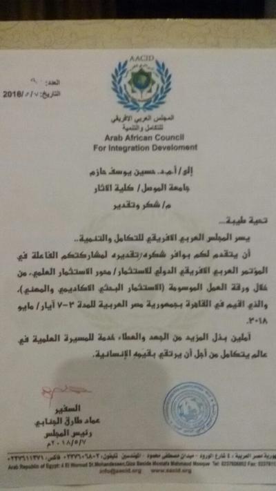 شارك الاستاذ المساعد الدكتور حسين يوسف حازم (المعاون العلمي لعميد كلية الاثار / جامعة الموصل في المؤتمر العربي الإفريقي الدولي للاستثمار / محور الاستثمار العلمي ببحثه الموسوم (( الاستثمار البحثي والأكاديمي والمهني )) في القاهرة وفي الدورة التدريبية (( تخطيط وإدارة الفعاليات والمؤتمرات والندوات وورش العمل )) التي أقيمت في شرم الشيخ / بجمهورية مصر العربية .
