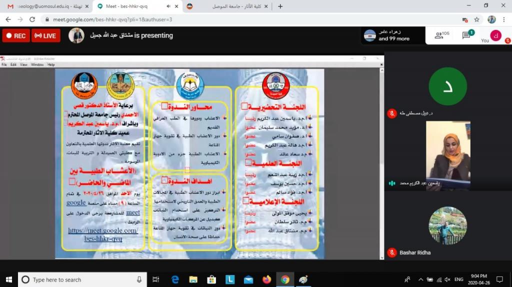 يوم الاحد الموافق 26/4/2020 في الساعة 9 مساءًوبمشاركة عدد من تدريسيي الكليات الثلاثة حيث تناولت ثلاث محاور- الاعشاب واستخداماتها في الطب العراقي القديم
