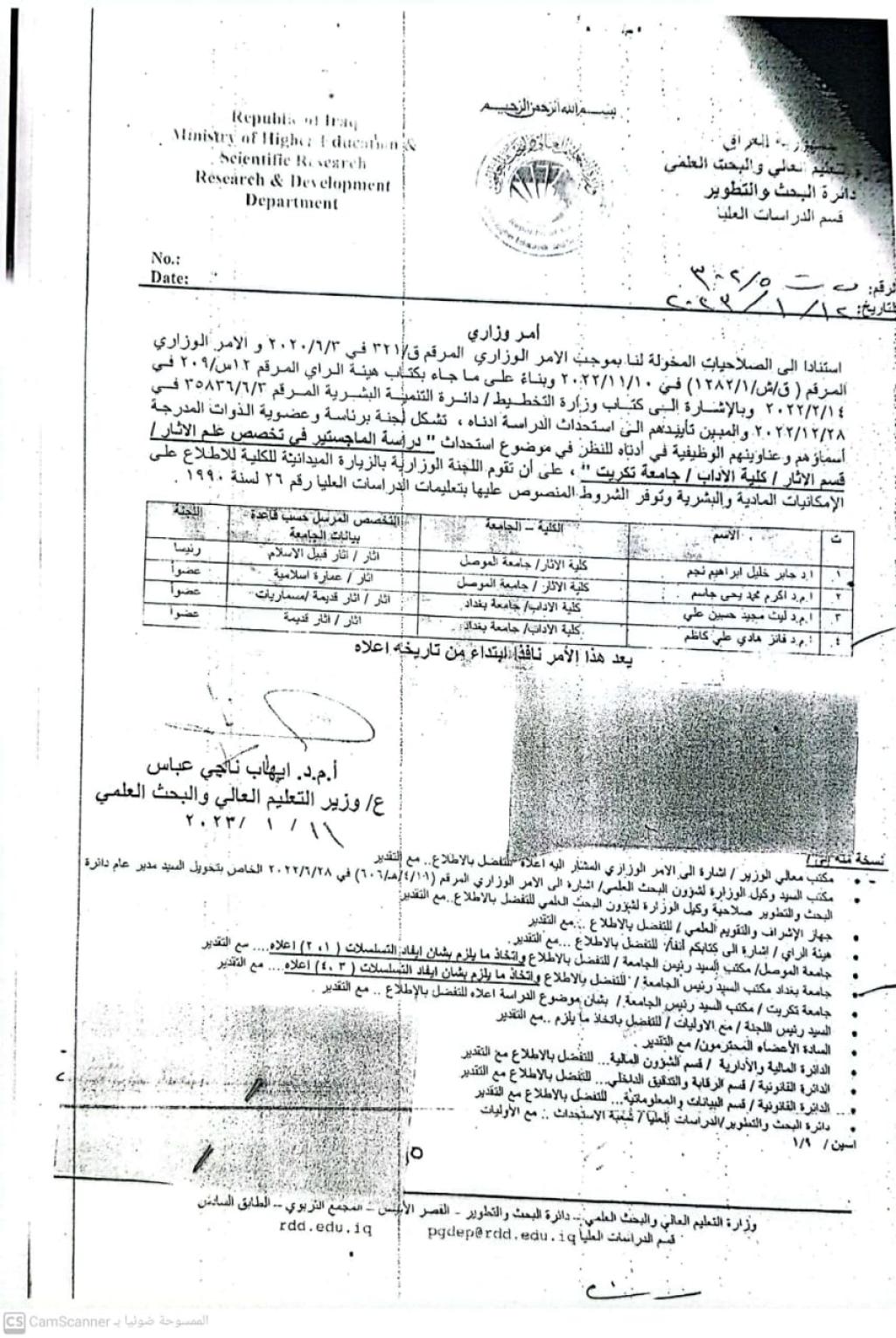 استناداً الى الامر الوزاري المرقم ب ت ٥ / ٣٠٢ في ١٢ / ١ / ٢٠٢٣ والمتضمن تشكيل لجنة برئاسة الاستاذ الدكتور جابر خليل ابراهيم الاستاذ المتمرس في كلية الاثار جامعة الموصل وعضوية كل من أ.م.د. اكرم محمد يحيى/ كلية الاثار/ جامعة الموصل و أ.م.د.ليث مجيد حسين / كلية الآداب جامعة بغداد و أ.م.د. فائز هادي علي / كلية الآداب/ جامعة بغداد . لاستحداث دراسة الماجستير في تخصص علم الاثار / قسم الاثار / كلية الآداب/ جامعة تكريت . وكان في استقبال اللجنة الاستاذ الدكتور وعد محمود رؤوف رئيس جامعة تكريت والأستاذ المساعد الدكتور مربد صالح ضامن عميد كلية الآداب .وقامت اللجنة بزيارتها الميدانية لقسم الاثار للإطلاع على الإمكانيات المادية والبشرية والمالية وتوفر الشروط المنصوص عليها بتعليمات الدراسات العليا رقم ٢٦ لسنة ١٩٩٠ .وعقدت اللجنة اجتماعات مع ذوي العلاقة في كلية الآداب بجامعة تكريت من أجل تقديم تقريرها المفصل الى وزارة التعليم العالي والبحث العلمي. وقد قام السيد رئيس جامعة تكريت بتكريم رئيس وأعضاء اللجنة الوزارية بكتب شكر ودرع الجامعة وسط حفاوة بالغة .