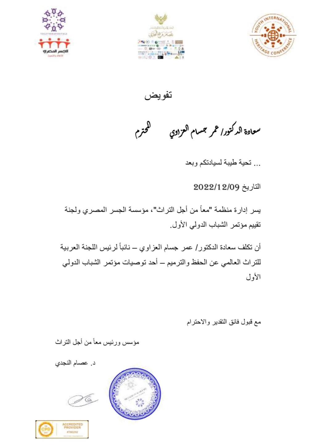 تكليف م.د. عمر جسام فاضل بمنصب نائب رئيس اللجنة العربية للتراث العالمي
