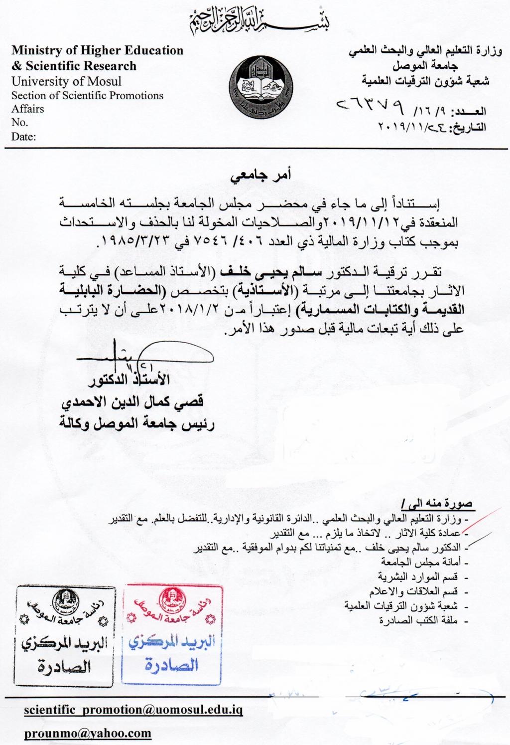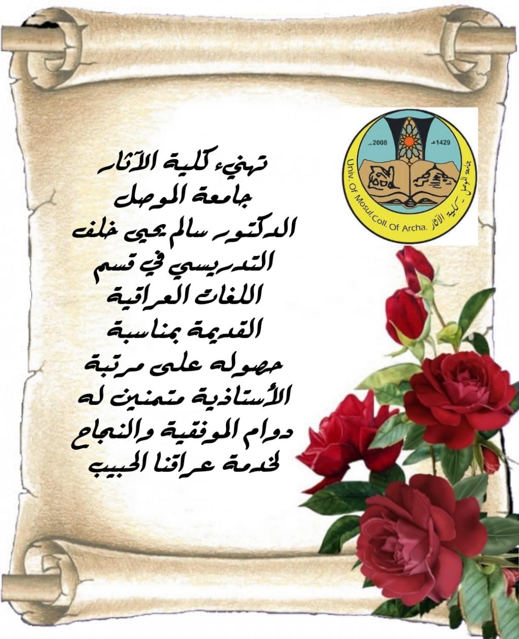 تهنيء كلية الآثار / جامعة الموصل الدكتور سالم يحيى خلف التدريسي في قسم اللغات العراقية القديمة بمناسبة حصوله على مرتبة (الأستاذية) متمنين له دوام الموفقية والنجاح لخدمة عراقنا الحبيب