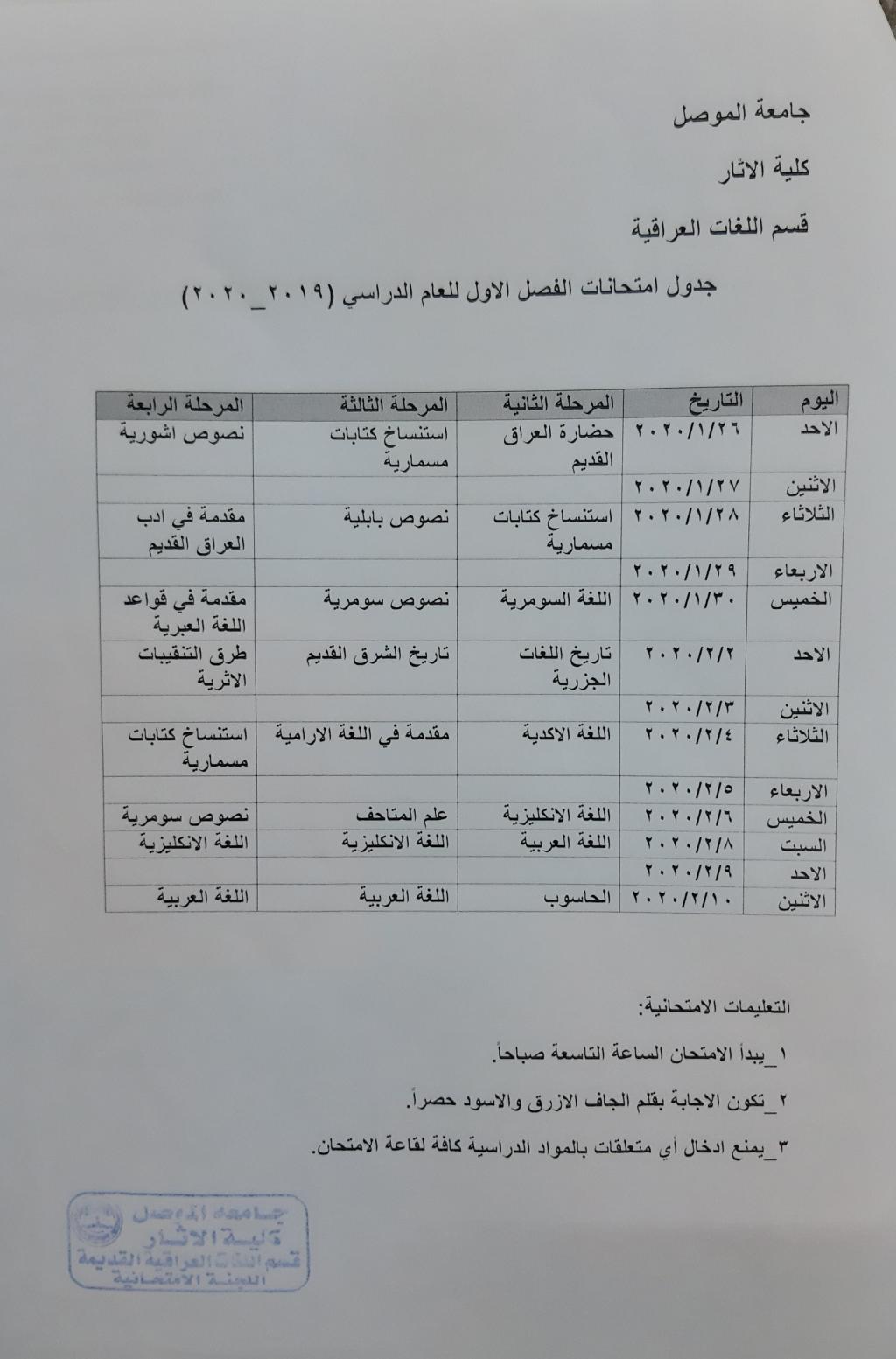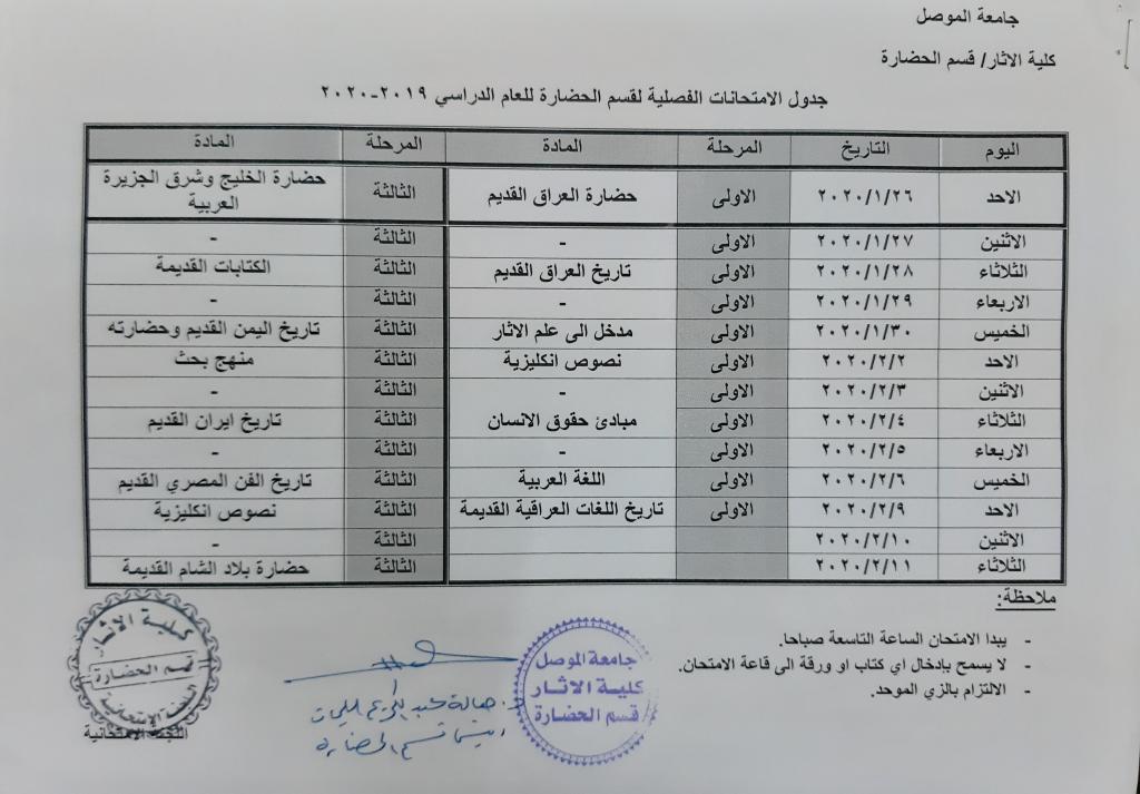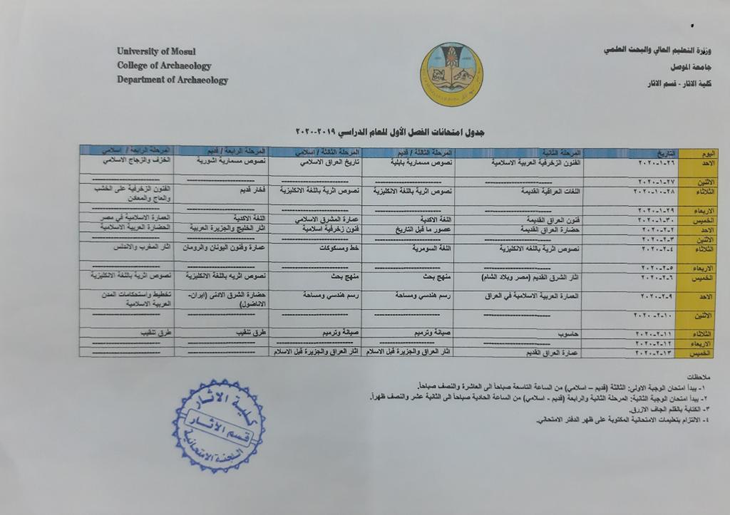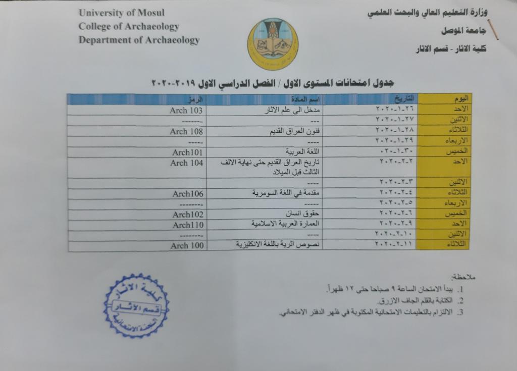 جداول امتحانات الفصل الدراسي الأول للمراحل الثانية والثالثة والرابعة وجداول امتحانات الكورس الأول للمستوى الأول لقسم الآثار وقسم اللغات العراقية القديمة وقسم الحضارة تبدأ الامتحانات يوم الأحد الموافق 2020/1/26 الساعة التاسعة صباحاً نتمنى النجاح والموفقية لطلبتنا الاعزاء