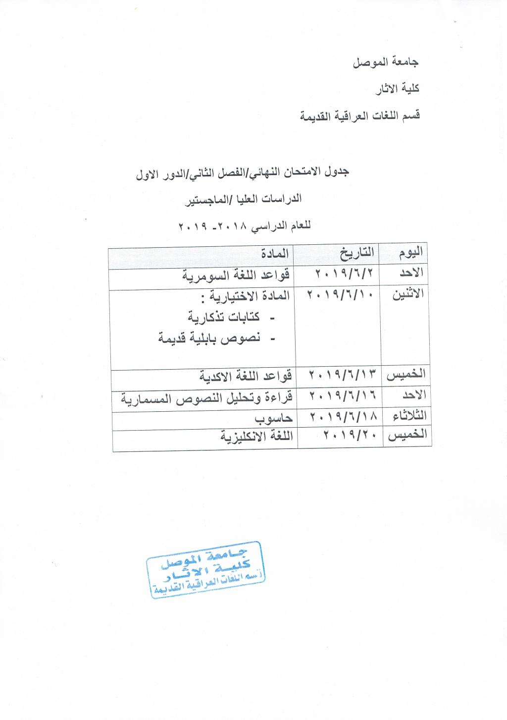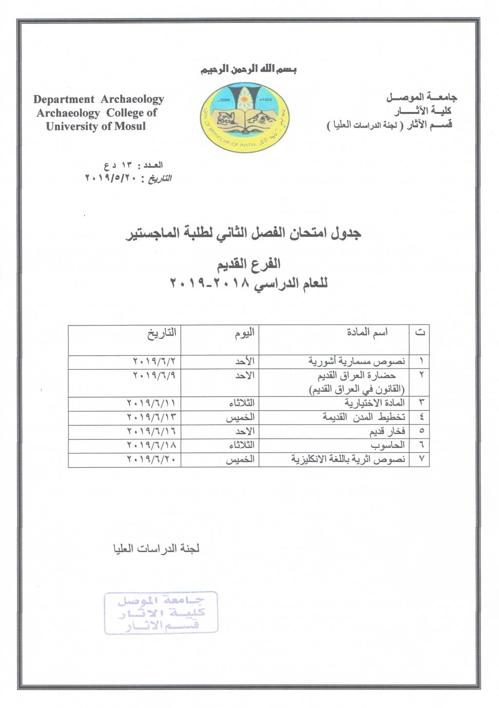الى طلبتنا الاعزاء أدناه جدول امتحانات الفصل الثاني لطلبة الدراسات العليا (الماجستير) للعام الدراسي (2018-2019) لقسمي الآثار واللغات العراقية القديمة في كلية الآثار بعد أجراء التعديل عليهنتمنا لطلبتنا الاعزاء النجاح والموفقية