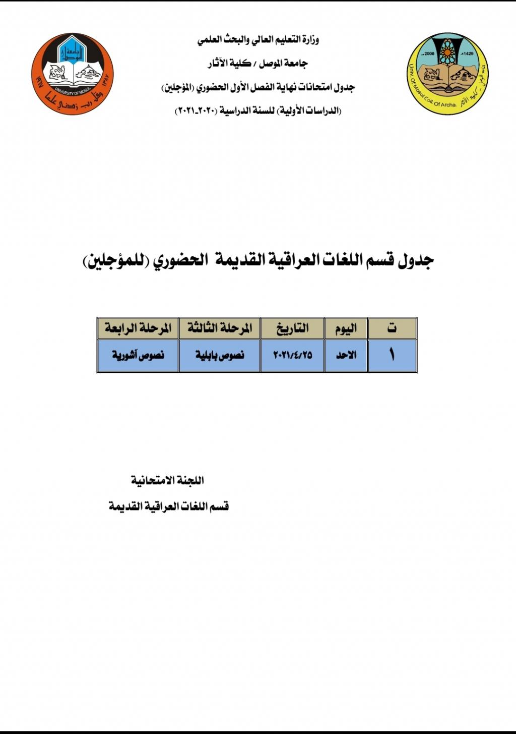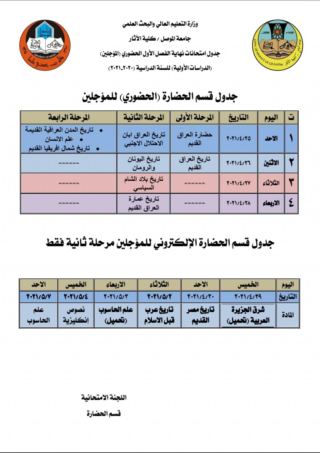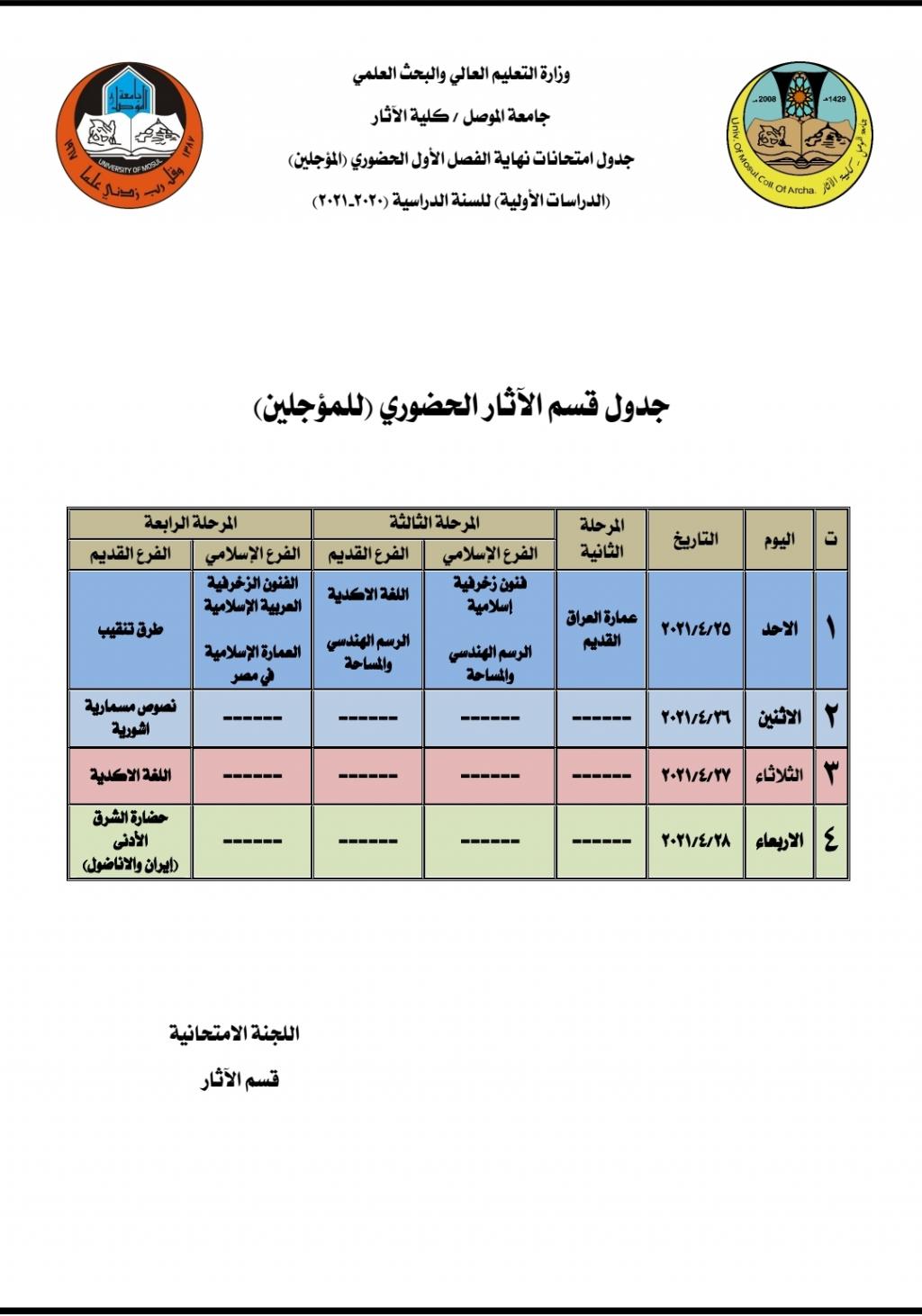((اعلان))كلية الآثار تعلن جدول امتحانات نهاية الفصل الدراسي الأول الامتحانات الحضورية (للمؤجلين)الدراسات الأولية للسنة الدراسية (2020-2021)