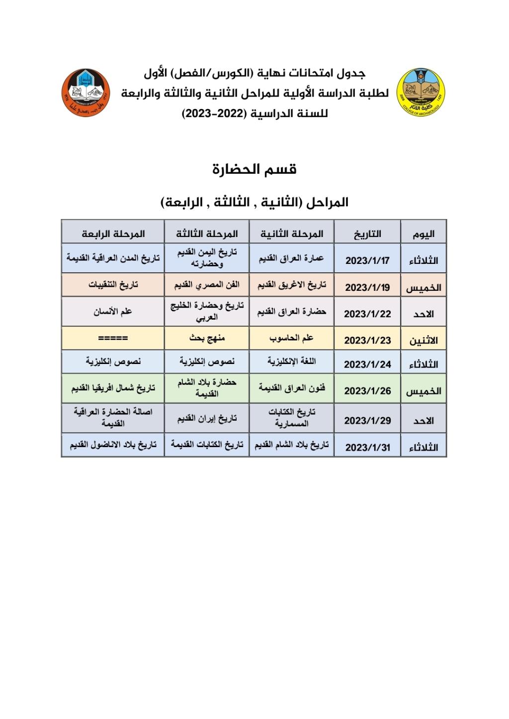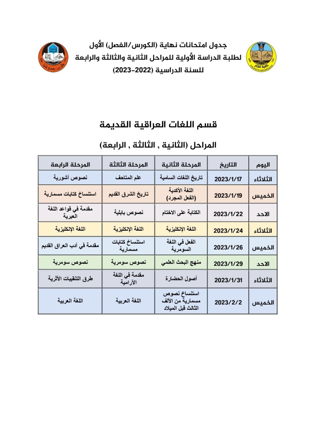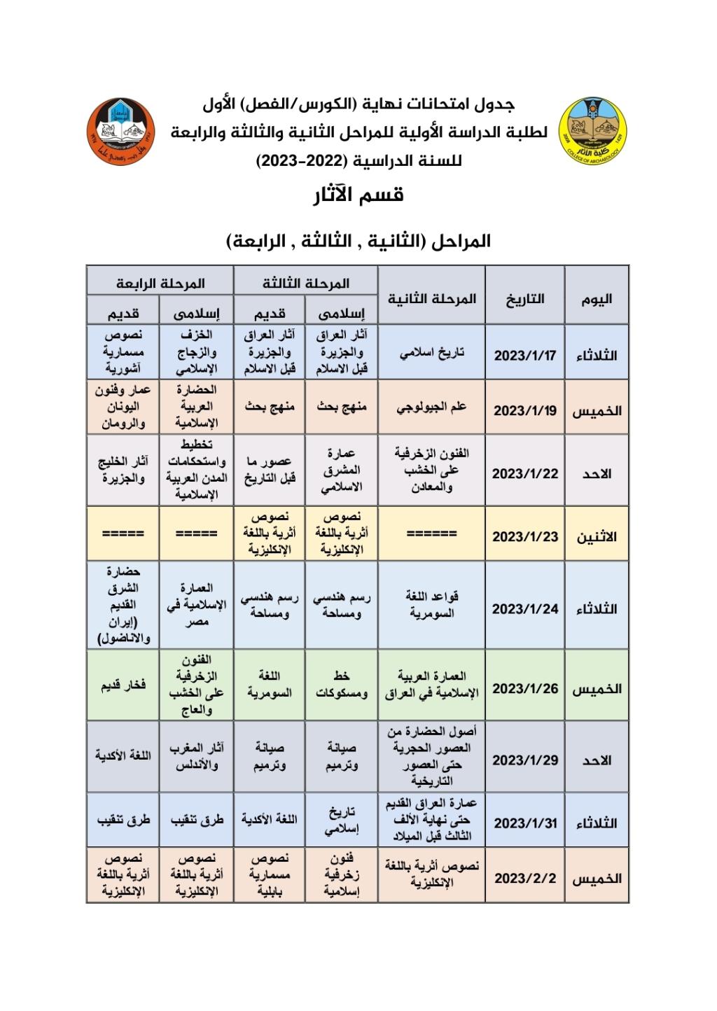 تعلن كلية الآثارعن جدول امتحانات نهاية (الكورس – الفصل) الأول لطلبة الدراسات الأولية للسنة الدراسية (2022-2023)مع تمنياتنا لجميع الطلبة بالموفقية والنجاحيمكنكم تنزيل الجدول بصيغة pdf من الرابط التاليجدول امتحانات نهاية (الكورس – الفصل) الأول لطلبة الدراسات الأولية للسنة الدراسية (2022-2023)