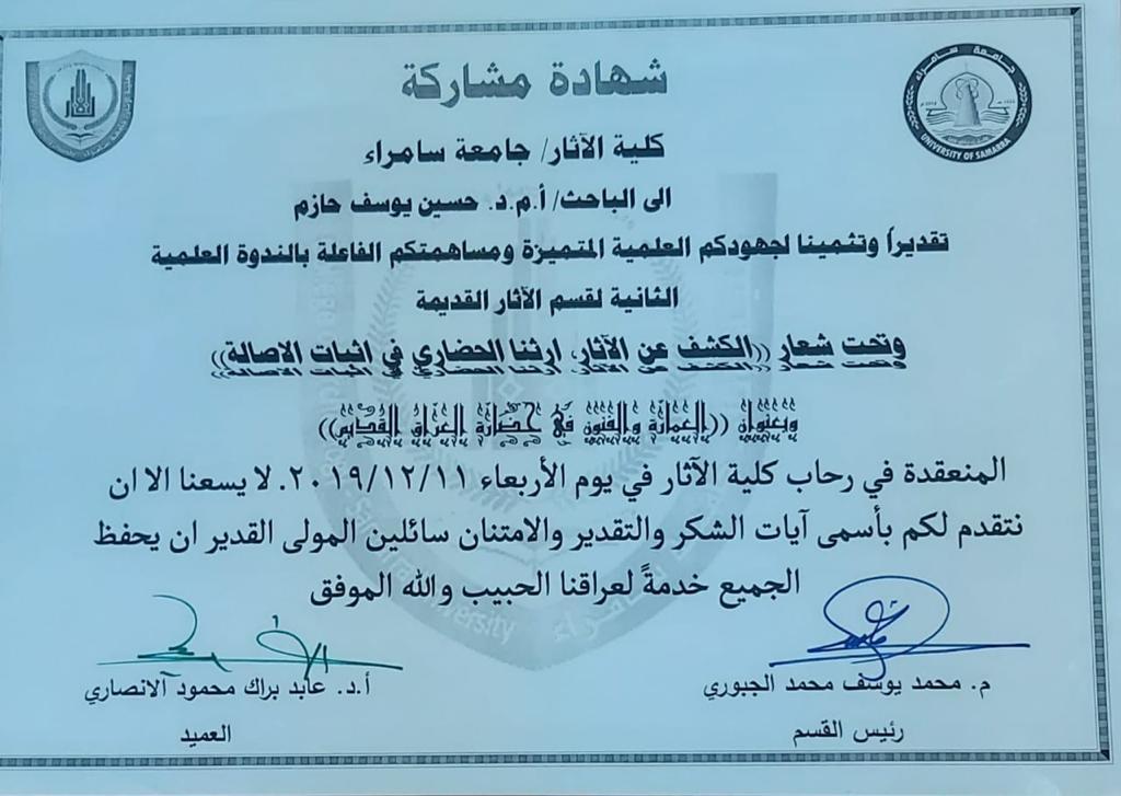حصول أ.م.د. حسين يوسف حازم معاون العميد للشؤون العلمية على شهادة مشاركة من جامعة سامراء / كلية الآثار تثميناً وتقديراً لجهوده العلمية المتميزة ومساهمته الفاعلة بالندوة العلمية الثانية لقسم الآثار القديمة تحت شعار (الكشف عن الآثار ، آرثنا الحضاري في اثبات الاصالة) المنعقدة في رحاب كلية الآثار جامعة سامراء يوم الأربعاء الموافق 2019/12/11 .