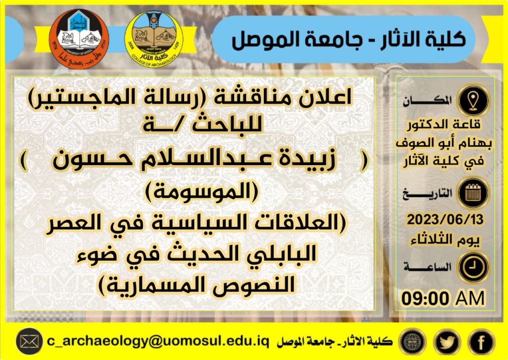 ناقش قسم الآثار في كلية الآثار بجامعة الموصل يوم الخميس 8 حزيران ٢٠٢٣ في قاعة الدكتور بهنام ابو الصوف في الكلية رسالة الماجستير الموسومة ( تنفيذ الاسد في بلاد الرافدين حتى نهاية العصر البابلي الحديث (٦٢٦-٥٣٩) ق.م.) حضر جانبا منها الاستاذ الدكتور قصي كمال الدين الاحمدي رئيس جامعة الموصل المحترم وعدد من أساتذة وطلبة الكلية.