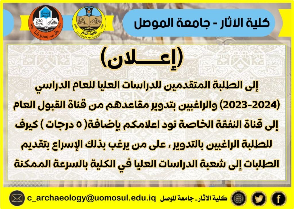 ناقش قسم الآثار في كلية الآثار بجامعة الموصل رسالة ماجستير عن ، خطط العمائر الخدمية في مدينة الموصل ابان العهد الجليلي (١١٣٩- ١٢٤٩هـ/ ١٧٢٦- ١٨٣٤م) يوم الاربعاء 9 آب ٢٠٢٣، في قاعة الدكتور بهنام ابو الصوف في الكلية، حضر جانبا منها الاستاذ المساعد الدكتور ياسر جابر خليل معاون عميد الكلية للشؤون العلمية و المدرس المساعد خالص عبد الكريم فرمان معاون عميد الكلية للشؤون الاداريةوعدد من أساتذة وطلبة الكلية .