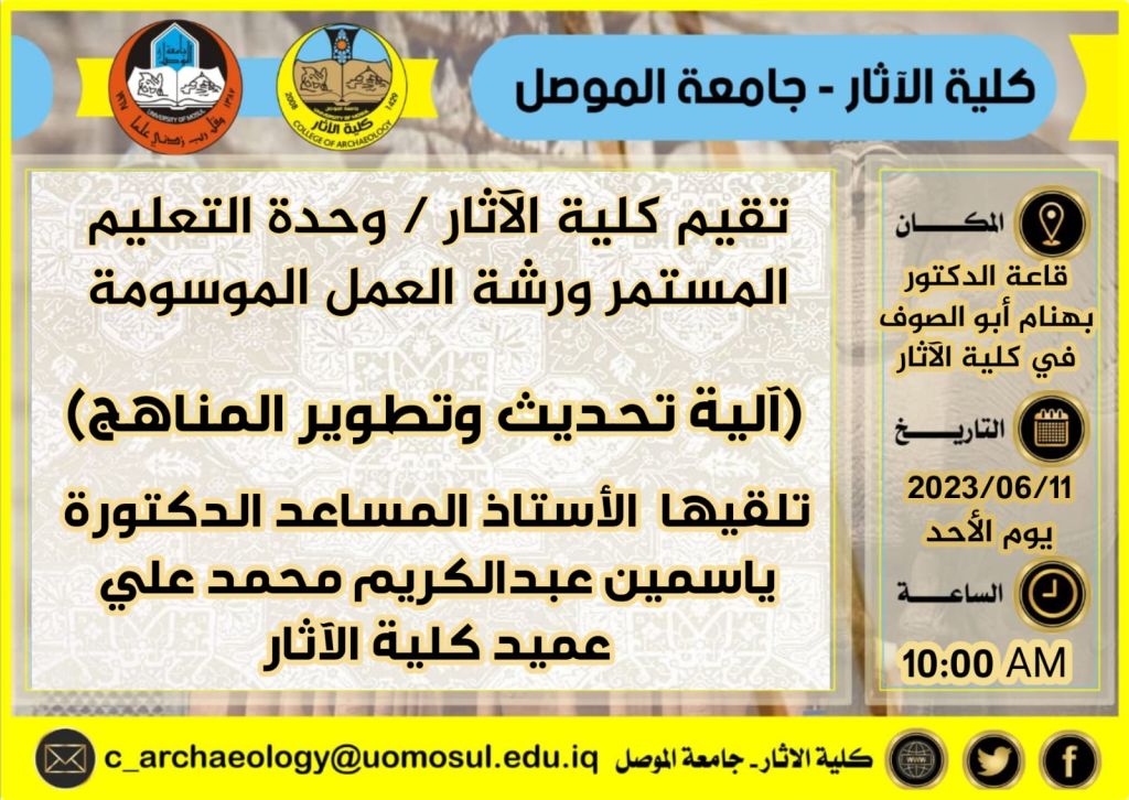 ناقش قسم الآثار في كلية الآثار بجامعة الموصل يوم الأربعاء ٧  حزيران  ٢٠٢٣ في قاعة الدكتور بهنام ابو الصوف في الكلية رسالة الماجستير الموسومة ( مخطط متحف الموصل ومقتنياته وسبل المعالجة ) حضر جانبا منها الدكتور محمود المعماري مدير دار المأمون في بغداد وعدد من أساتذة وطلبة الكلية.