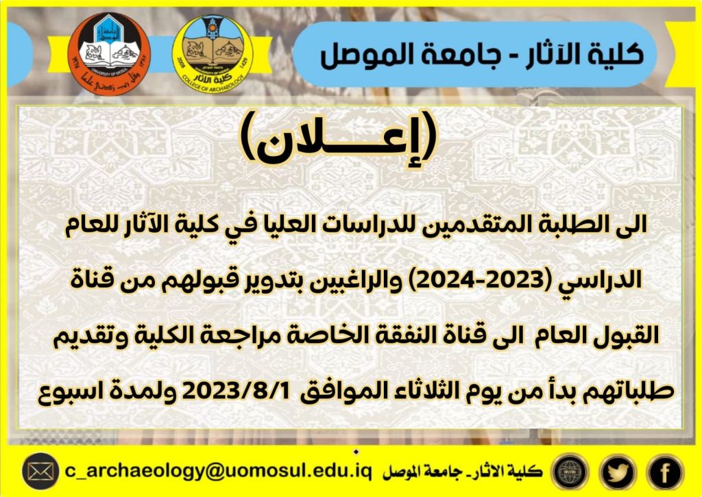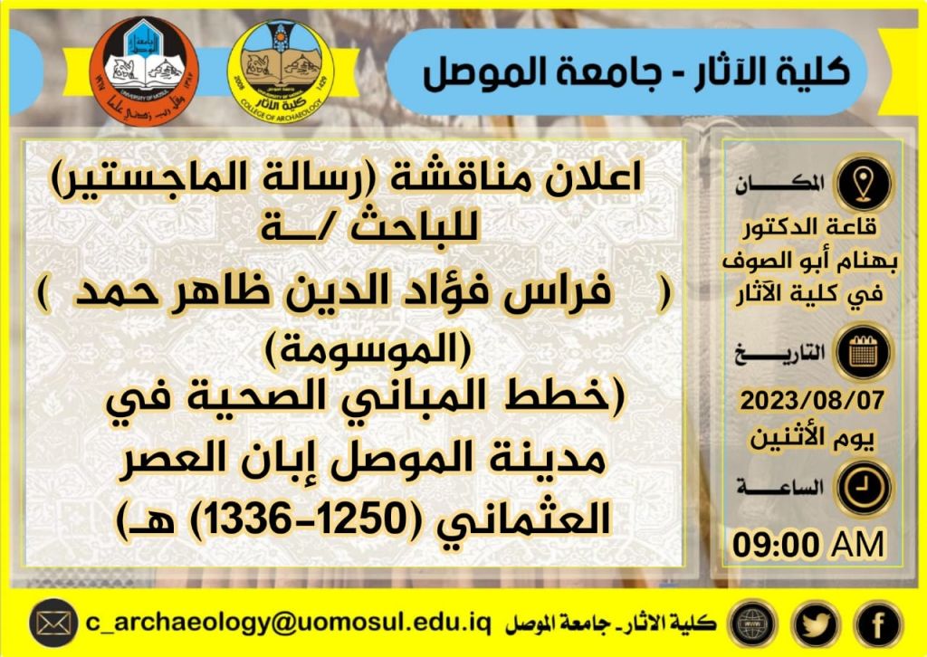 ناقش قسم الحضارة في كلية الآثار بجامعة الموصل يوم الخميس الموافق ٣ آب ٢٠٢٣ في قاعة الدكتور بهنام أبو الصوف في الكلية رسالة الماجستير الموسومة (الأعياد والاحتفالات في المملكة الحثية (1680 – 1207 ق.م)) وحضر جانباً منها الأستاذ المساعد الدكتور ياسر جابر خليل معاون عميد كلية الآثار للشؤون العلمية وعدداً من تدريسيي الكلية.