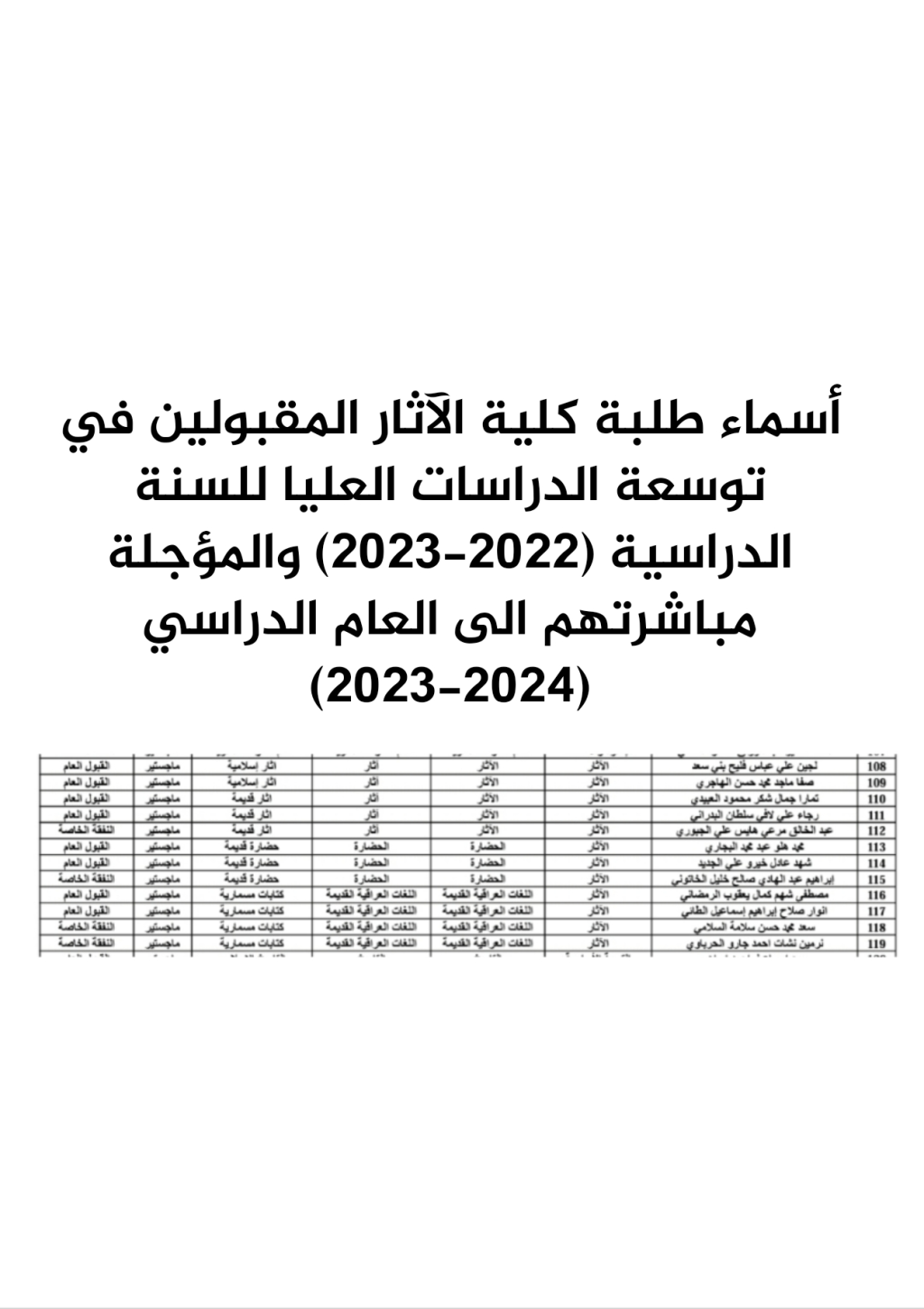 صدور الأمر الجامعي الخاص بقبول طلبة الدراسات العليا (التوسعة المؤجلة) للسنة الدراسية (2022-2023)المؤجلة مباشرتهم للسنة الدراسية (2023-2024)متمنين لهم التوفيق في مسيرتهم الدراسيةعلى الطلبة المقبولين مراجعة شعبة شؤون الدراسات العليا في الكلية واكمال الاجراءات التالية1- أخذ استمارة الفحص الطبي وإكمالها في دائرة اللجان الطبية.2- استكمال اجراءات الكفالة في شعبة الشؤون القانونية في الكلية.3- جلب الاجازة الدراسية لمن كان موظف أو موظفة خلال 90 يوم من تاريخ صدور الأمر الجامعي.4- استكمال إجراءات المساءلة والعدالة في شعبة الشؤون القانونية في الكلية لمواليد 1987 فما دون.