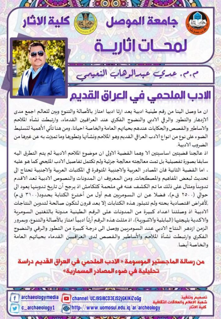 ضمن نشاطات كلية الآثار / جامعة الموصل وبرامجها المعدة برنامج (لمحات آثارية)نقدم لكم اللمحة الأولى للأستاذ المساعد الدكتورة ياسمين عبدالكريم محمد علي عميد الكليةتحت عنوان(المشهد الفني والنص المسماري في ضوء المنحوتات الآشورية)