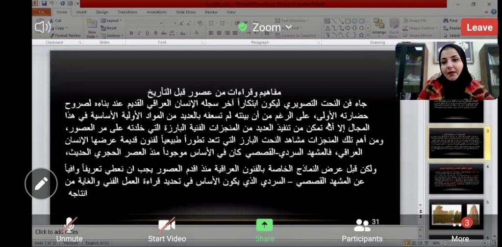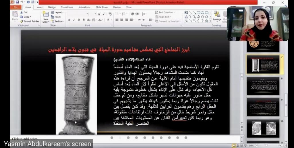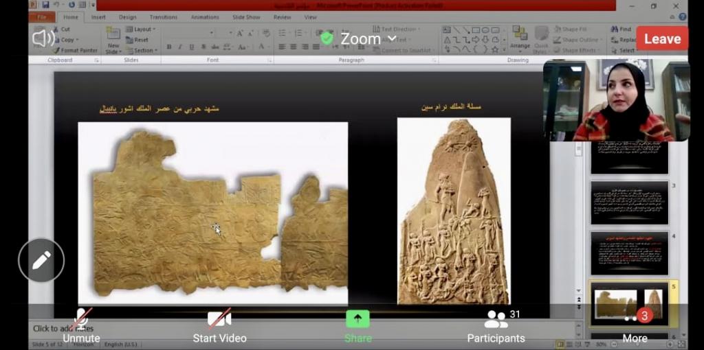 شاركت السيدة عميد كلية الاثار أ.م.د ياسمين عبد الكريم في المؤتمر الدولي الثالث لآثار بلاد الرافدين في كلية الاثار /جامعة القادسية ببحثها الموسوم (مفاهيم وقراءات من الفنون العراقية القديمة) يوم 23/3/2022 عبر الفضاء الالكتروني.