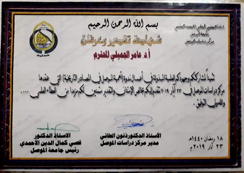 شارك الأستاذ الدكتور عامر عبدالله نجم الجميلي رئيس قسم الآثار في كليتنا في الندوة العلمية الموسومة (أهمية الموصل في المصادر التاريخية) التي أقامها مركز دراسات الموصل يوم الخميس الموافق 2019/5/23 الساعة التاسعة والنصف صباحاً على قاعة المنتدى العلمي والأدبي ببحثه الموسوم (قرى سريانية وعربية منسية من خلال كتابي "الرؤساء" لتوما المرجي – أسقف مرج الموصل – من القرن التاسع عشر الميلادي و "تاريخ الموصل" لأبي زكريا الأزدي (توفي سنة 334 هجرية – 954 ميلادي دراسة وتحقيق في الجغرافية التاريخية)