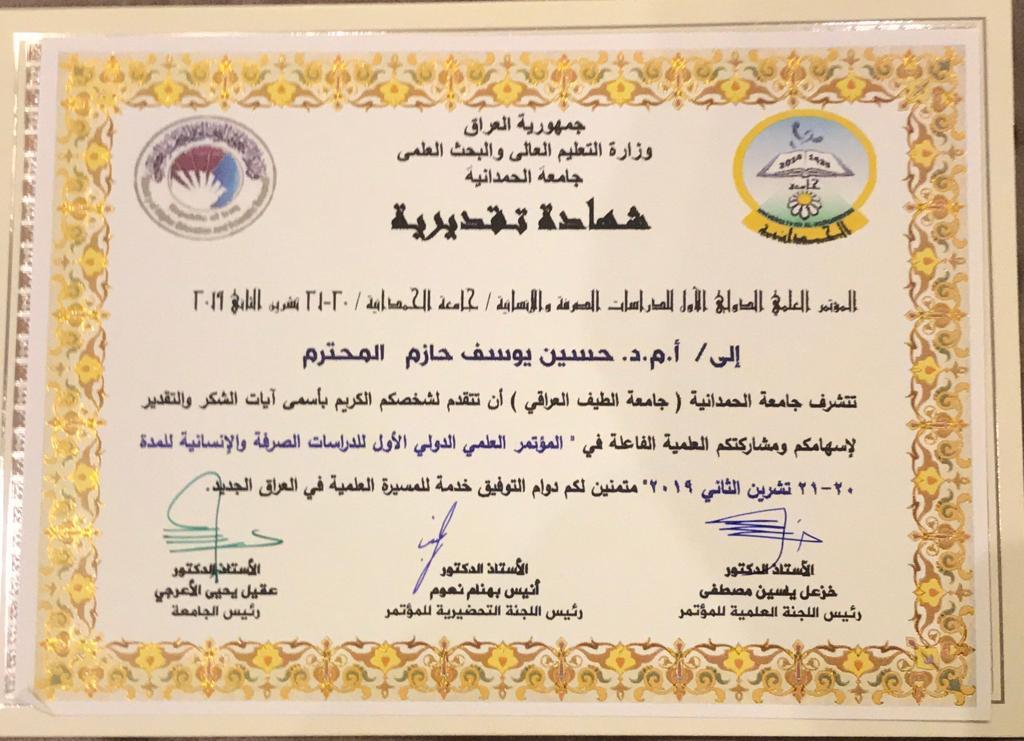 مشاركة الأستاذ المساعد الدكتور حسين يوسف حازم في المؤتمر العلمي الدولي الأول للدراسات الصرفة والإنسانية