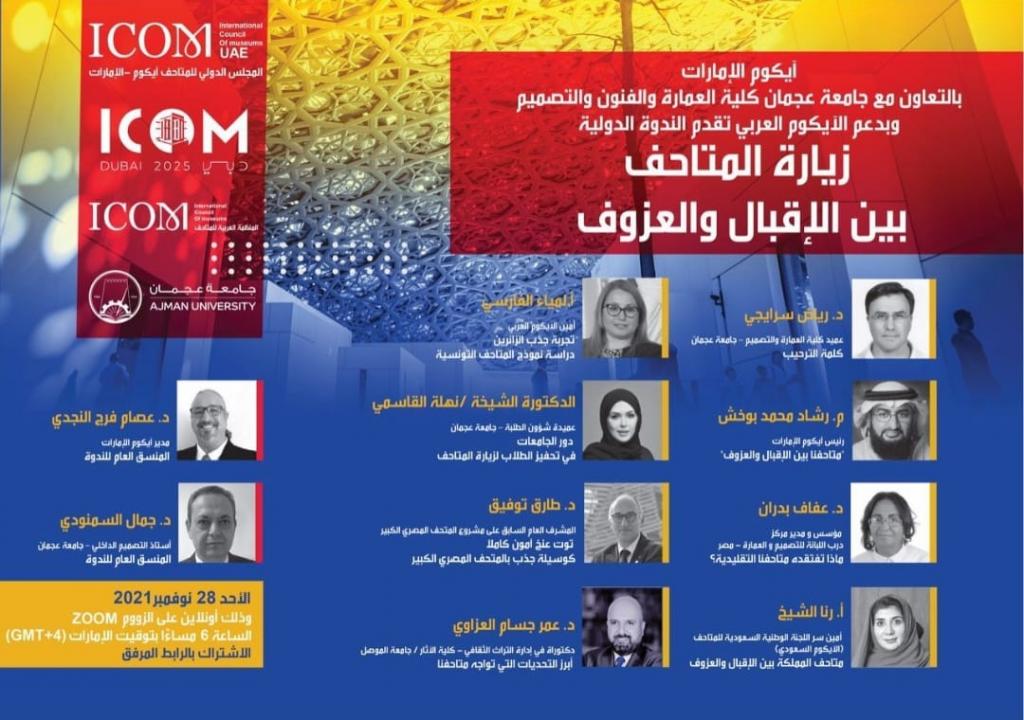 مشاركة الدكتور عمر جسام العزاوي التدريسي في قسم الآثار، ممثلاً عن جامعة الموصل والعراقفي ندوة دولية افتراضية عن (المتاحف بين الإقبال والعزوف) التي نظمها المجلس الدولي للمتاحف في الأمارات بلتعاون مع كلية العمارة والفنون والتصميم في جامعة عجمان، بتاريخ 28/11/2021،وبمشاركة العديد من الخبراء والأكاديميين من الدول العربية منها مصر والعراق والسعودية والأمارات وتونس.