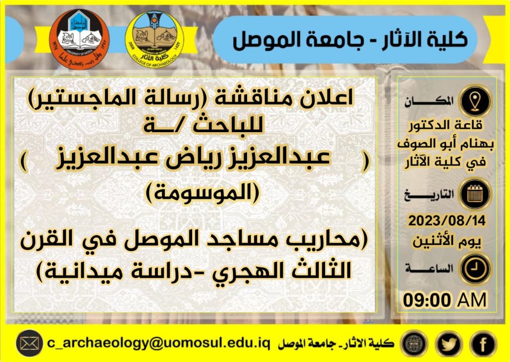 موعد مناقشة رسالة الماجستير الموسومة (محاريب مساجد الموصل في القرن الثالث الهجري -دراسة ميدانية)