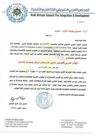 شارك الاستاذ المساعد الدكتور حسين يوسف حازم معاون العميد كلية الاثار للشؤون العلمية بجامعة الموصل في المؤتمر العربي الافريقي الدولي للاستثمار لرجال وسيدات الاعمال والمنعقد تحت شعار (( مصر خزائن الارض )) وتحت رعاية وزارة الاستثمار وبحضور ممثلين من الامم المتحدة .