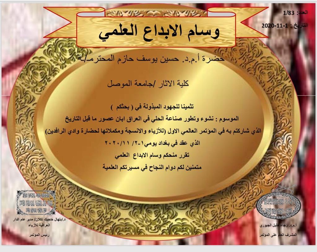 حصول أ.م.د. حسين يوسف حازم معاون عميد كلية الآثار للشؤون العلمية على وسام الابداع والتميز من قبل الدار العراقية للأزياء برعاية وزارة الثقافة والسياحة والآثار، تثميناً لجهوده المبذولة في بحثه الموسوم (نشوء وتطور صناعة الحلي في العراق ابان عصور ما قبل التاريخ) الذي أقيم في بغداد يومي 1-2 تشرين الثاني 2020 .