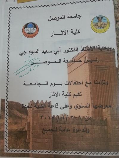 ابتهاجا بالذكرى الحادية والخمسين لتأسيس جامعة الموصل، وتزامنا مع احتفالات النصر الكبير وتحرير مدينة الموصل وكامل التراب العراقي من دنس الاعداء.. تحتفل جامعتنا العريقة بيومها الاغر في الاول من نيسان 2018 وتتضمن اقامة فعاليات فنية وثقافية ورياضية ومعارض متنوعة وسباق الماراثون وايقاد الشعلة وحفلات وانشطة اخرى داخل الحرم الجامعي .كما تقيم كلية الاثار معرضها السنوي تزامنا مع احتفالية يوم الجامعة على قاعة الكلية (قسم اللغات العراقية القديمة)