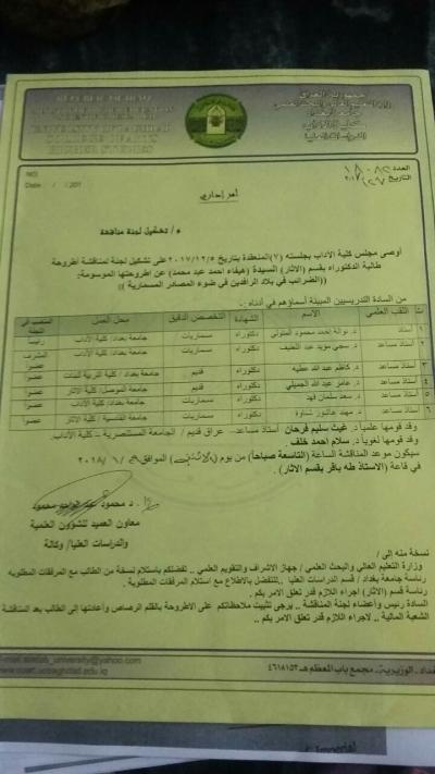 ناقش الاستاذ الدكتور عامر عبدالله الجميلي التدريسي بقسم الاثار / كلية الاثار / جامعة الموصل طالبة الدكتوراه هيفاء احمد عبد قسم الاثار / كلية الاداب / جامعة بغداد ، والموسومة (الضرائب في بلاد الرافدين في ضوء المصادر المسمارية)
