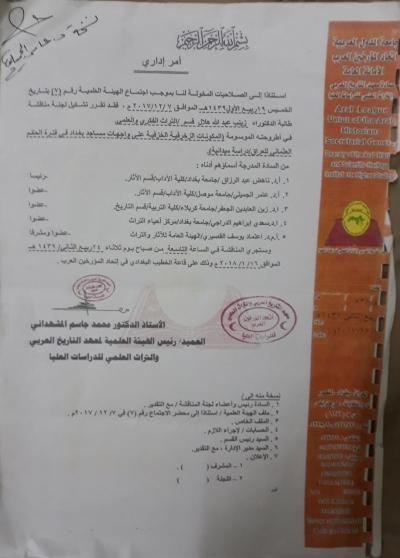 ناقش الاستاذ الدكتور عامر عبدالله الجميلي التدريسي بقسم الاثار / كلية الاثار / جامعة الموصل اطروحة الدكتوراة للطالبة زينب عبدالله هلال من قسم التراث الفكري والعلمي التابع الى الهيئة العلمية لمعهد التاريخ العربي والموسومة (المكونات الزخرفية على واجهات مساجد بغداد في فترة الحكم العثماني للعراق "دراسة ميدانية").